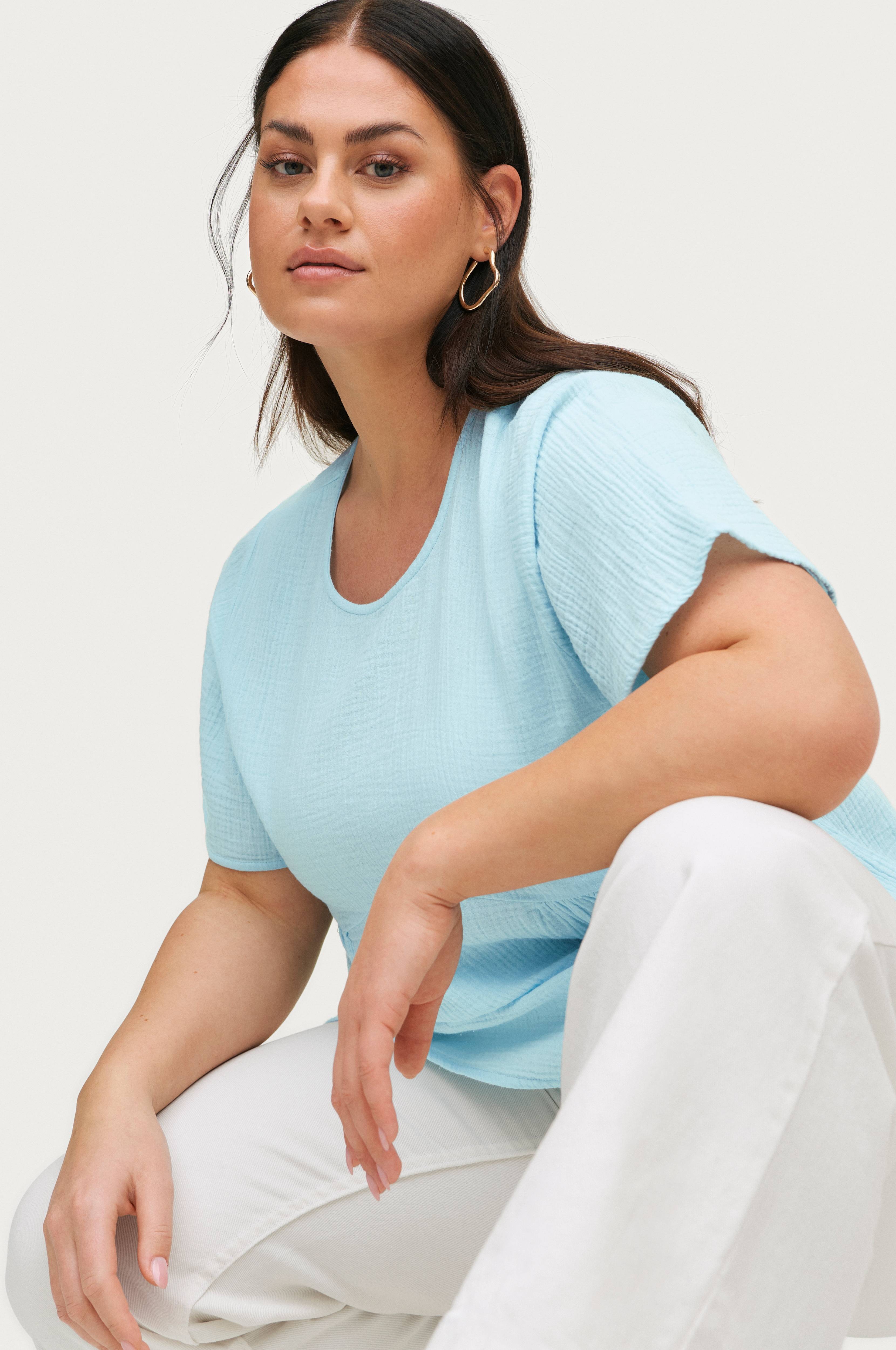 Tunikaen mangler tyngde og fall. Den ble også veldig firkantet på meg, og den tverrgående sømmen havnet ikke på rett sted. Stoffet er luftig i bølgemønster-kvalitet og behagelig mot huden.