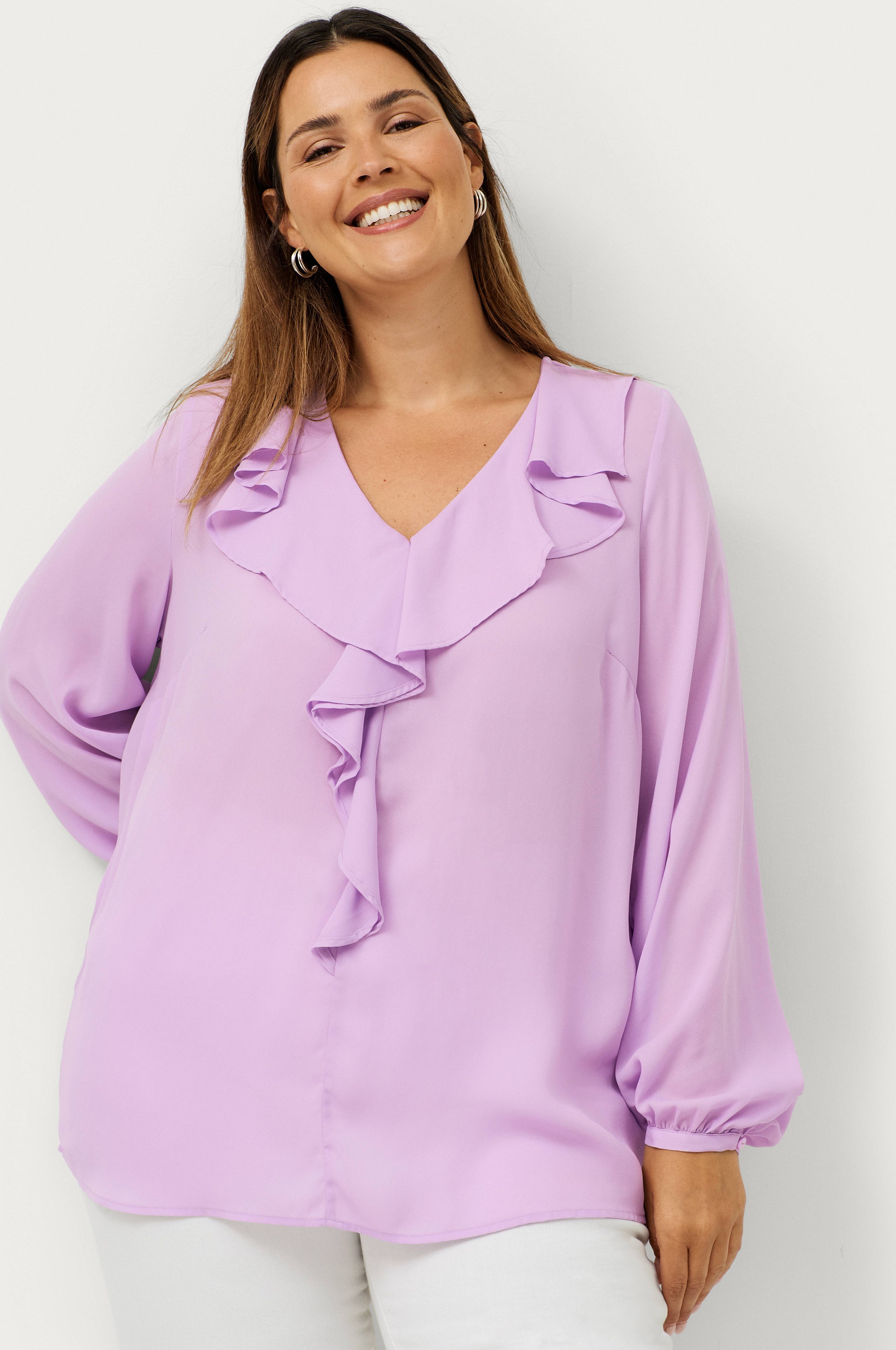 Bluse med V-utringning med volang foran. Lange ballongermer med knapp i ermekantene. Fremstilt i tynn, vevd kvalitet som er noe transparent. Lengde ca. 76 cm i str 42/44.