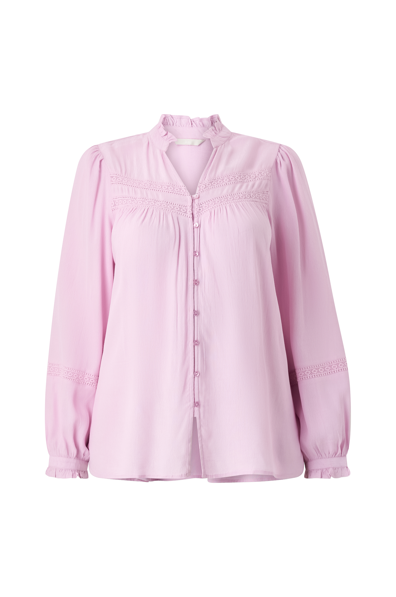 • V-hals snitt • Volang i halsen og ved armenden • Blondedetaljer oppover foran og på ermene • Knapper foran • Lengde: 74 cm i størrelse XL • Pluss-størrelser