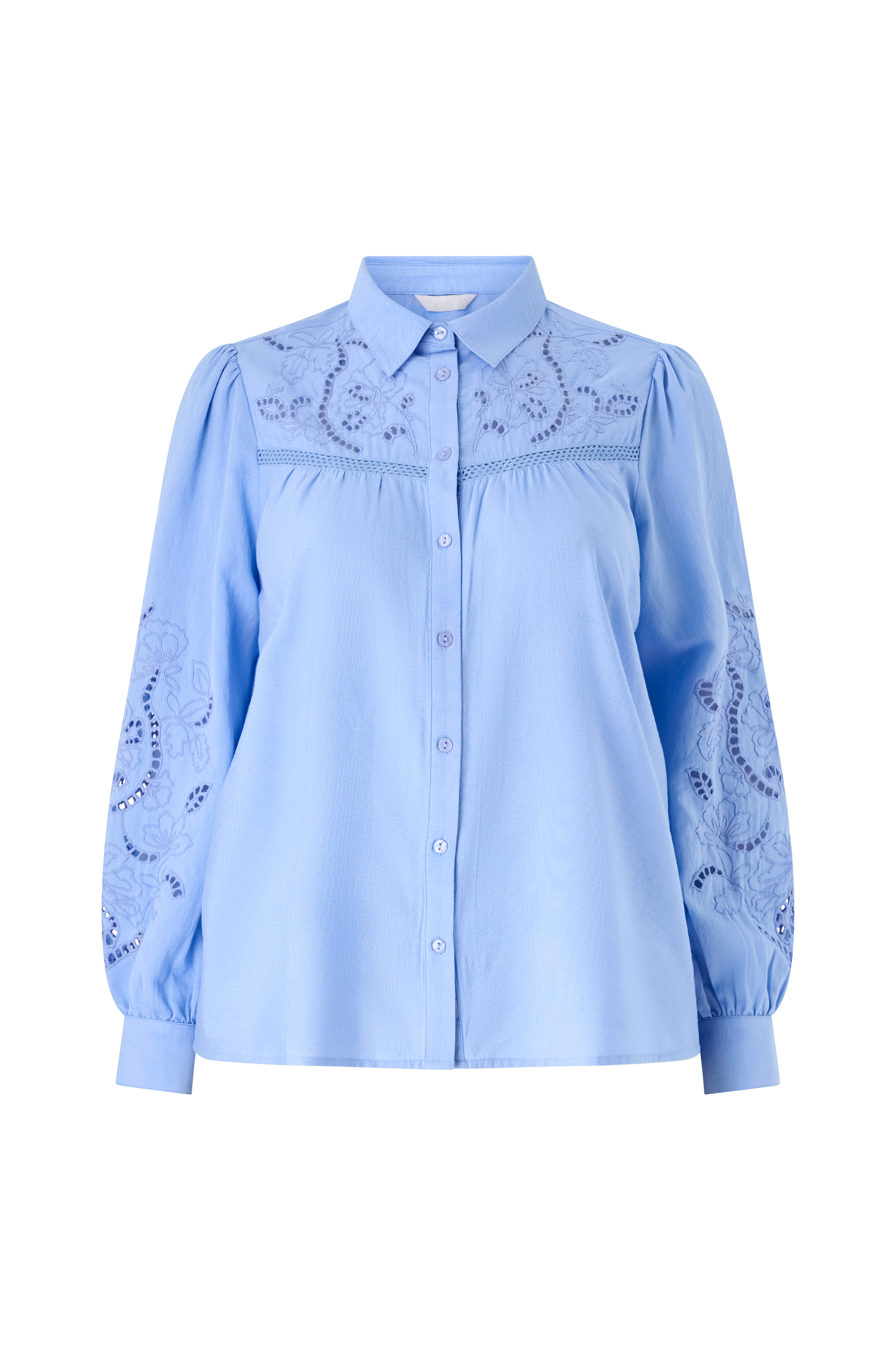 • Bluse i lett skrukket materiale med krage • Hullbroderier oppover foran og langs med ermene • Frontknepping foran • Lange puffermer med mansjetter i ermeslutten • Avrundet hem • Lengde: 72 cm i størrelse XL