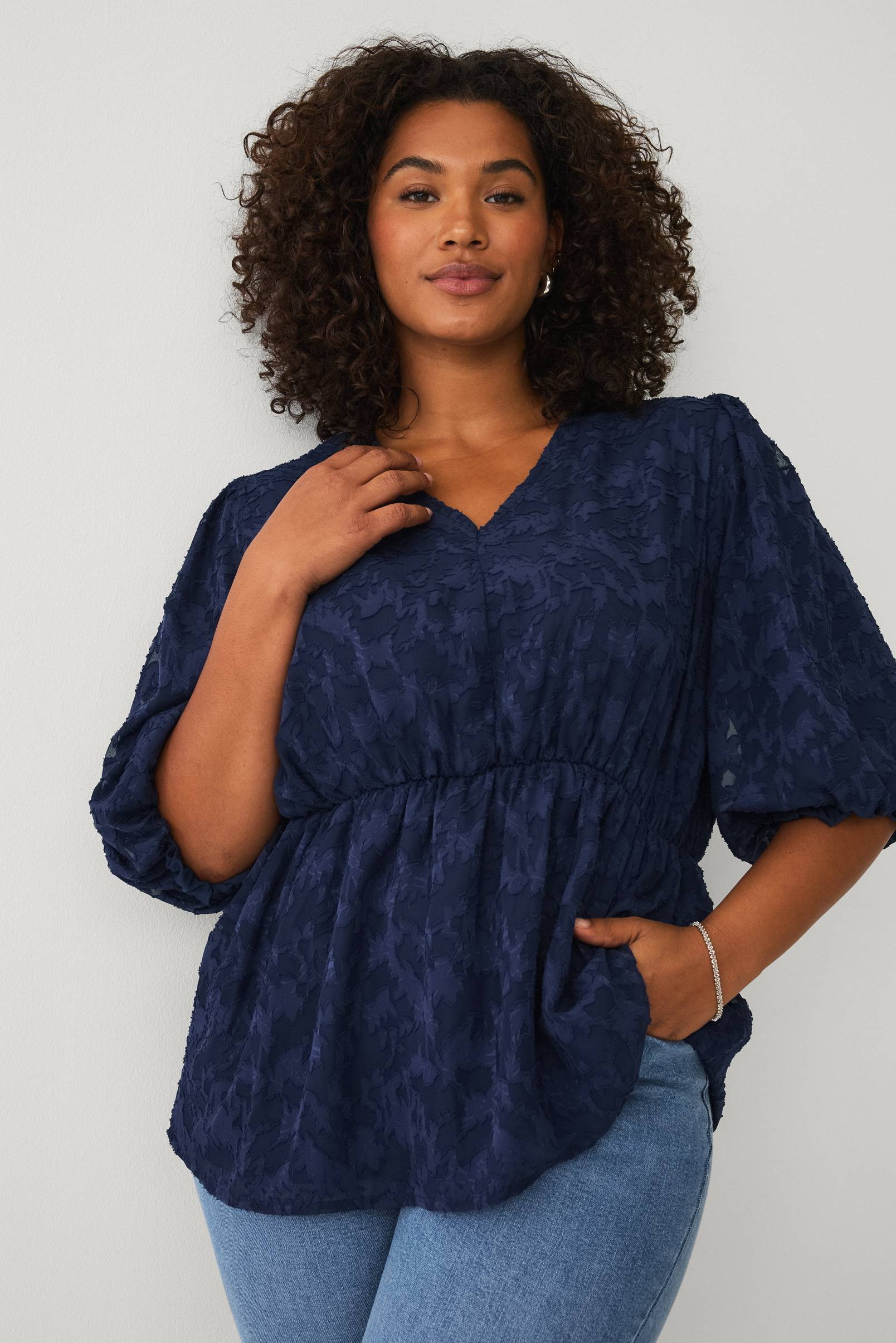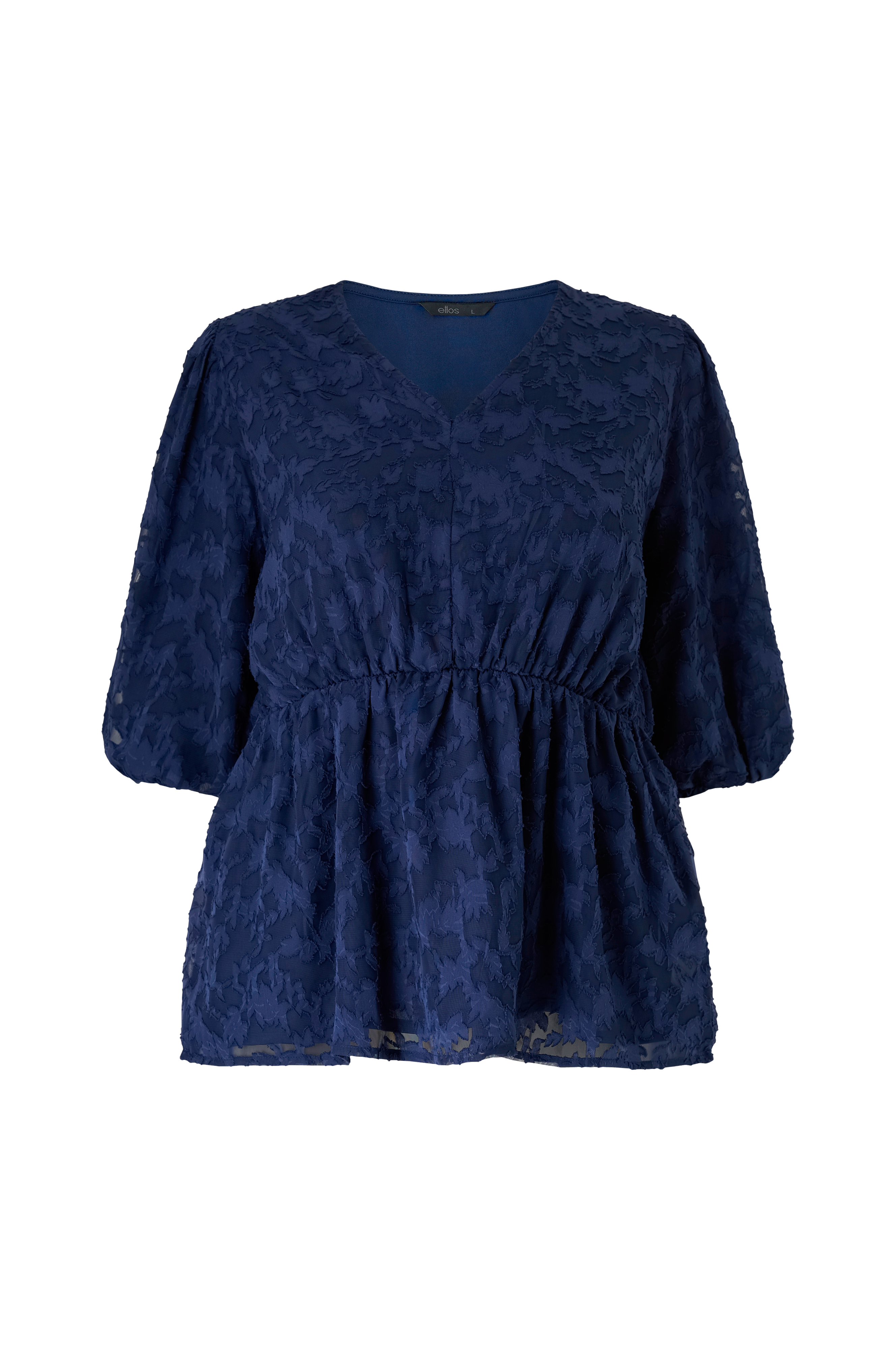 • Bluse i jacquardvevd chiffon • V-formet hals • Halvlange ballongermer med puff på toppen og gummistrikk i ermeslutten • Elastisk utskjæring ved midjen • Trikotfôr • Lengde: 74 cm i størrelse XL