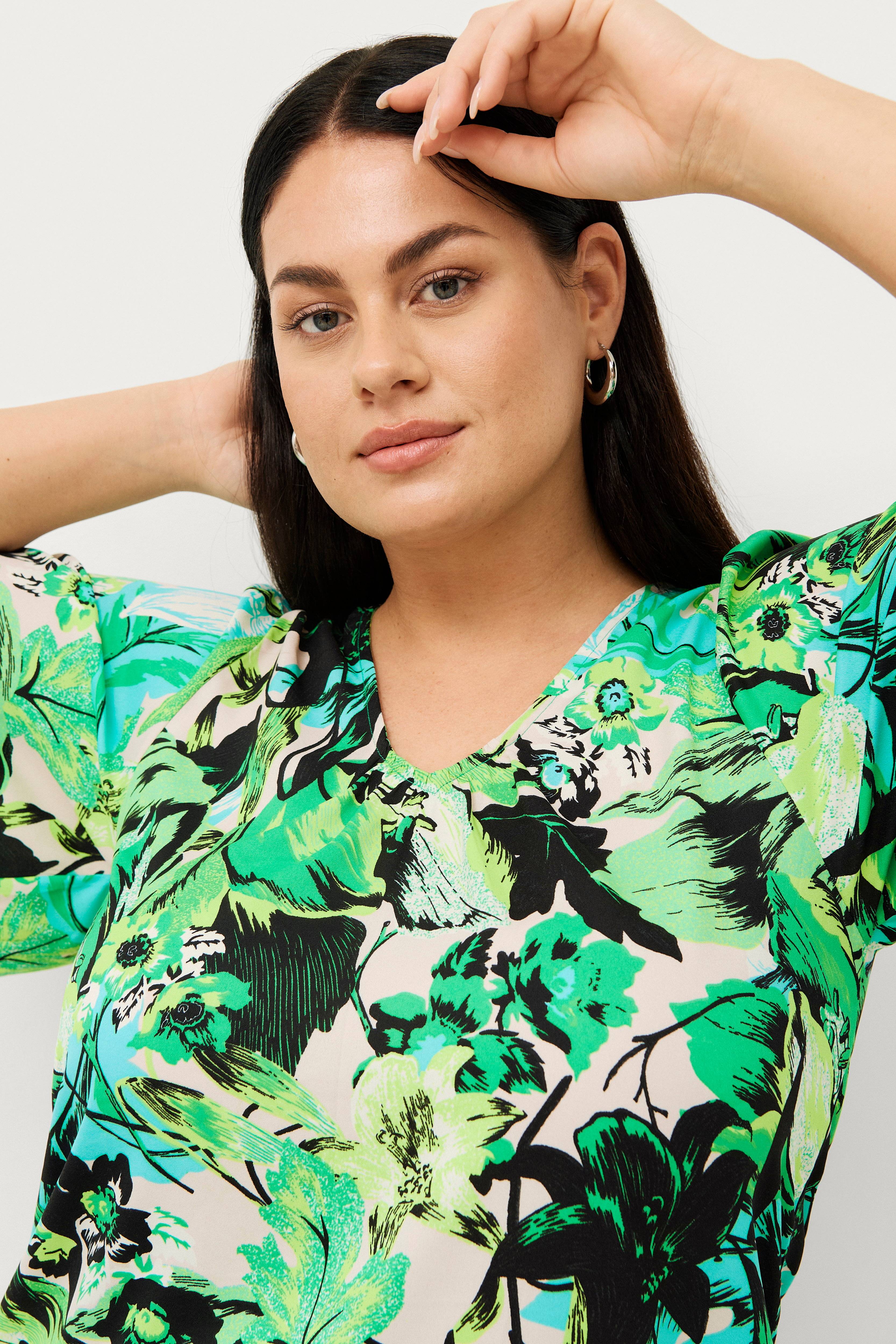 Sval sommer bluse. Ikke gjennomsiktig. Nydelige grønnfarger, som på bildet. Passe str.til meg med stor mage(50-52). Kanskje litt vid for slanke folk. Min nye sommer favoritt. Fin til skjørt…