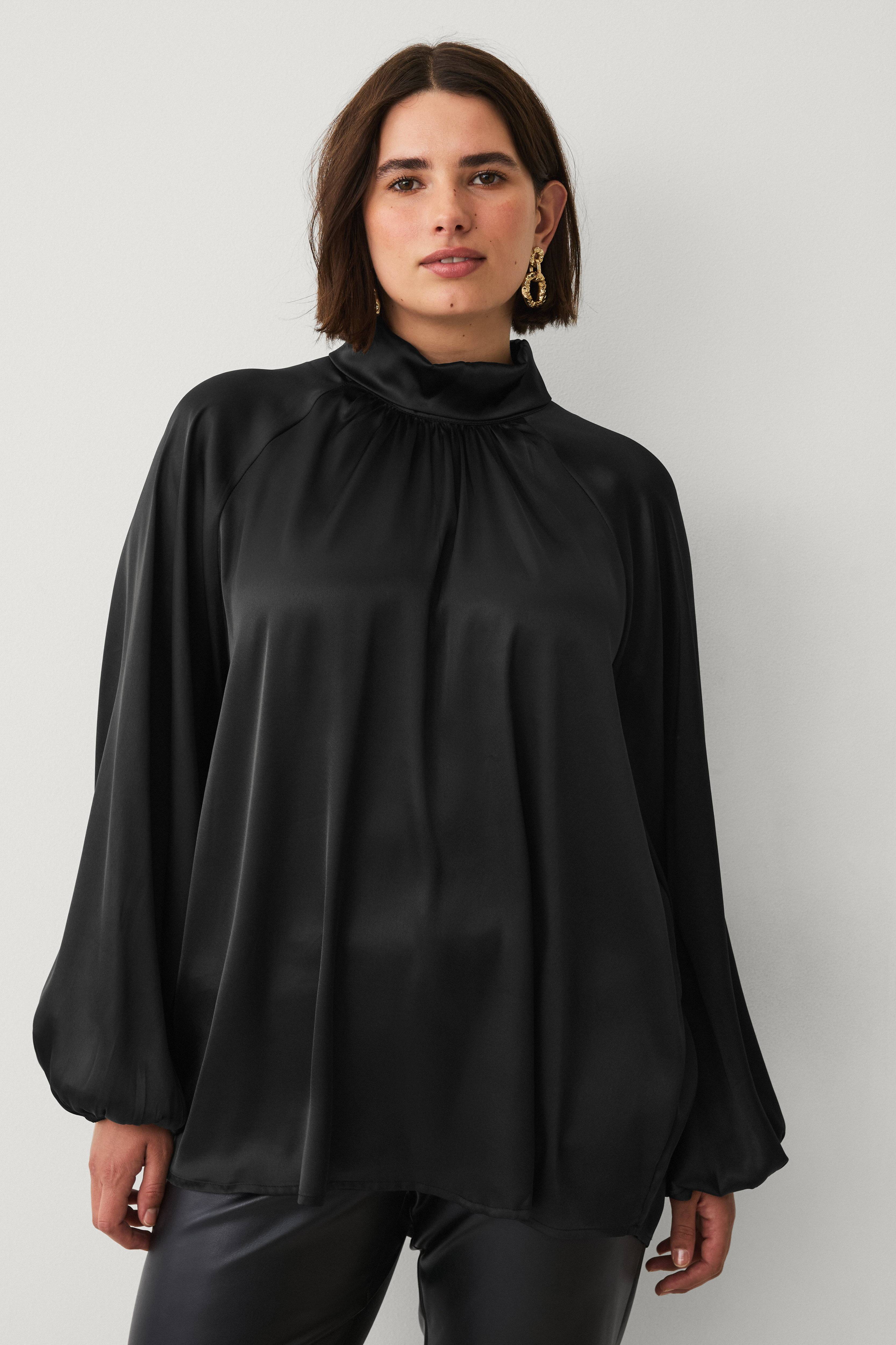• Uformell modell • Høy krage med knapper i nakken og rynke foran • Ekstra vidt raglanerme med gummistrikk i ermeslutten • Avrundet hem • Pluss-størrelser • Lengde: 86 cm i størrelse L