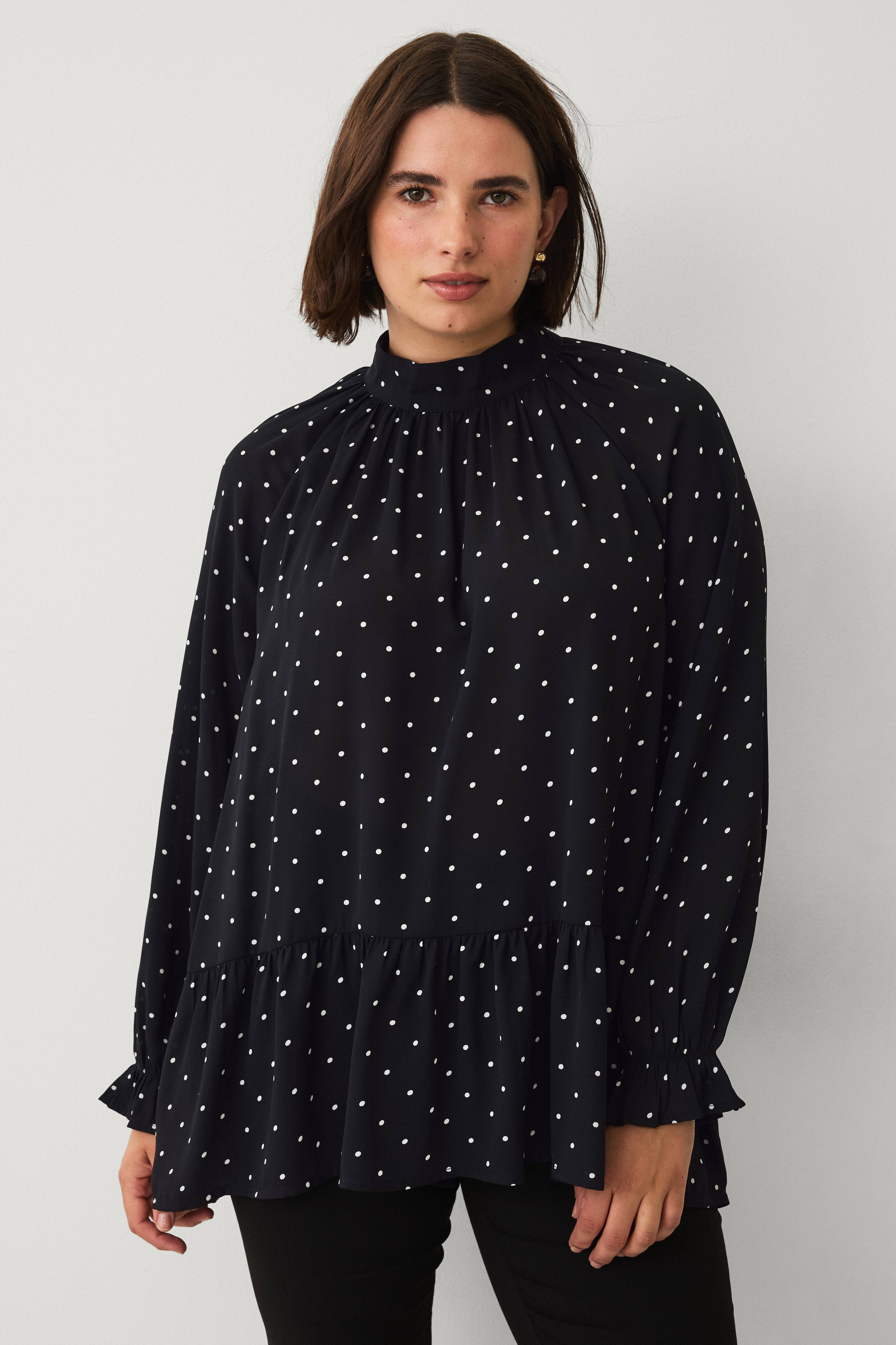 • Bluse i chiffon • Høy krage • Skjær bakpå med knapper • Lange ermer • Volang i ermeslutten og på bunnen • Krympet detalj foran og bakpå • Lengde: 78 cm i størrelse XL