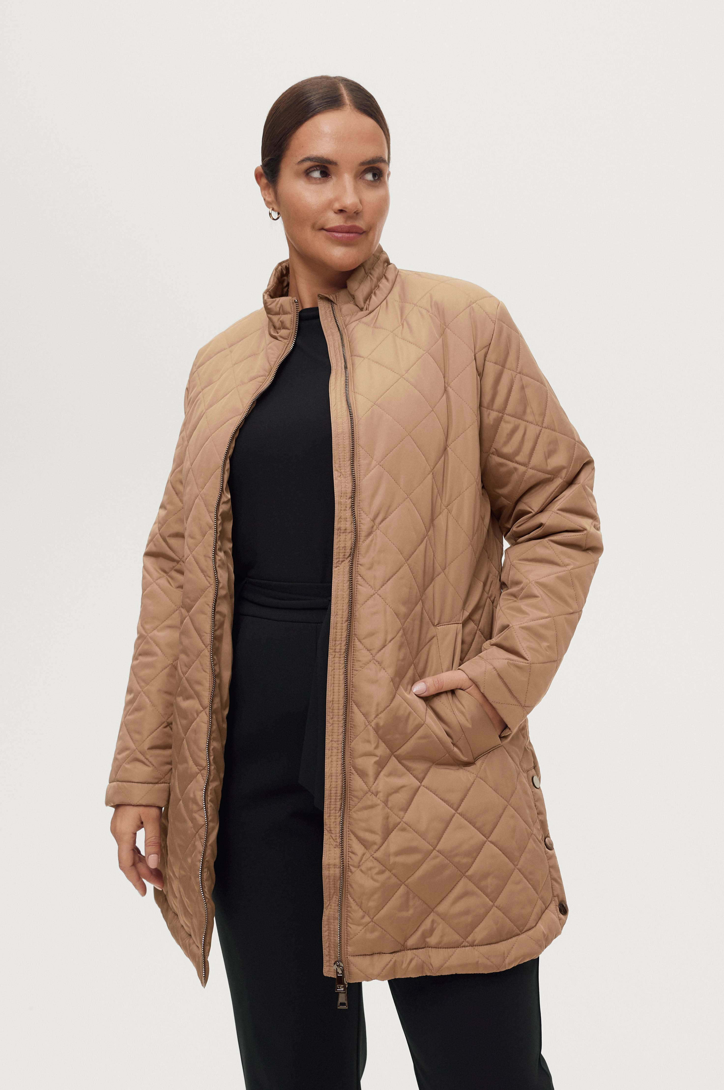Jakke Bryanna med quiltet ytterstoff med glans, lett vattering og gråmelert trikotfôr. Toveisglidelås og to lommer foran. Trykknapper nederst i sidene for justerbar vidde. Lengde bak ca. 96 cm i str 46/48.
