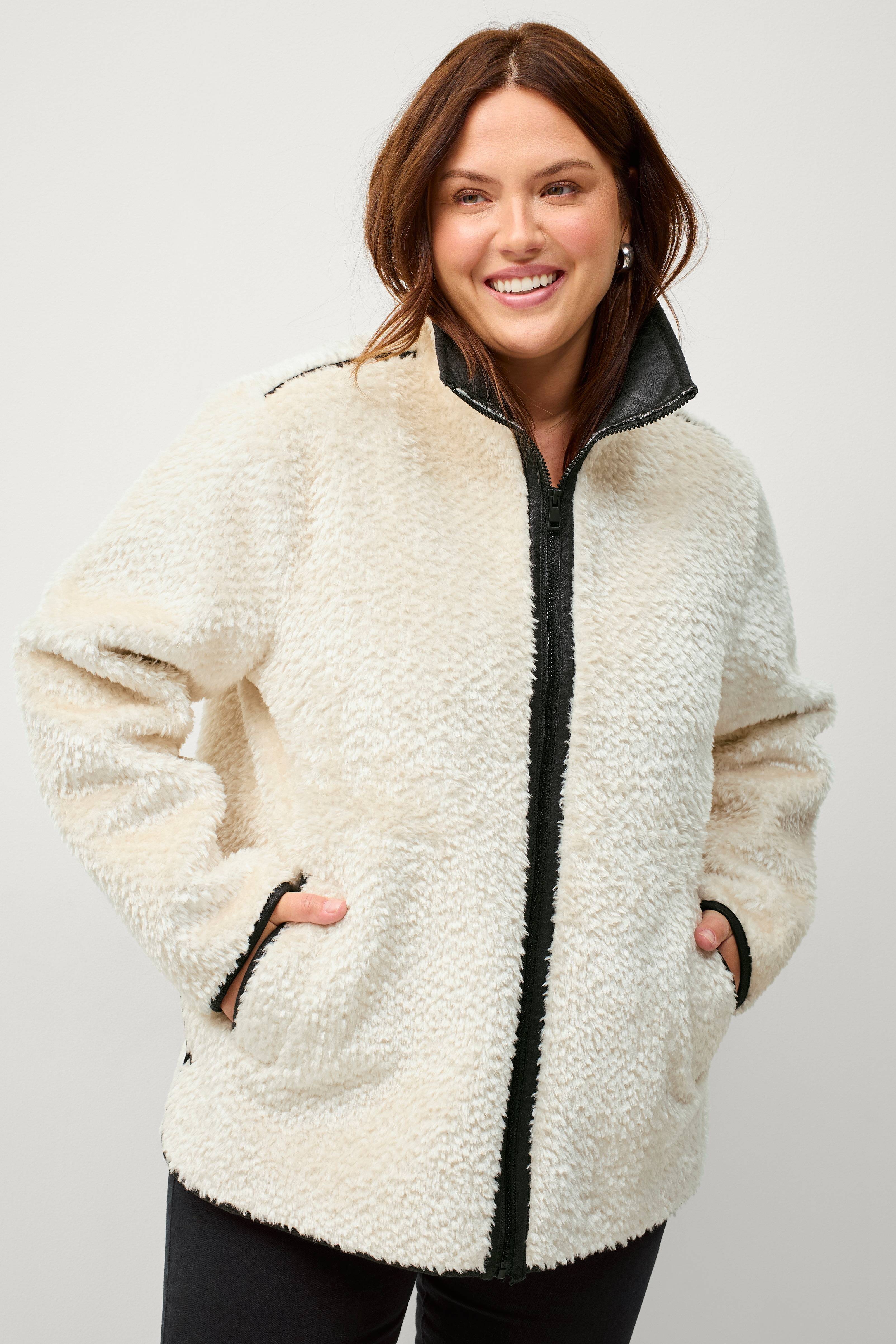 • Rett modell i kunstig skinn med matchende kanter • Glidelås foran • Høy krage • Innfelte lommer • Skjær med trykknapper nede i sidene • Lengde: 74 cm i størrelse 42/44