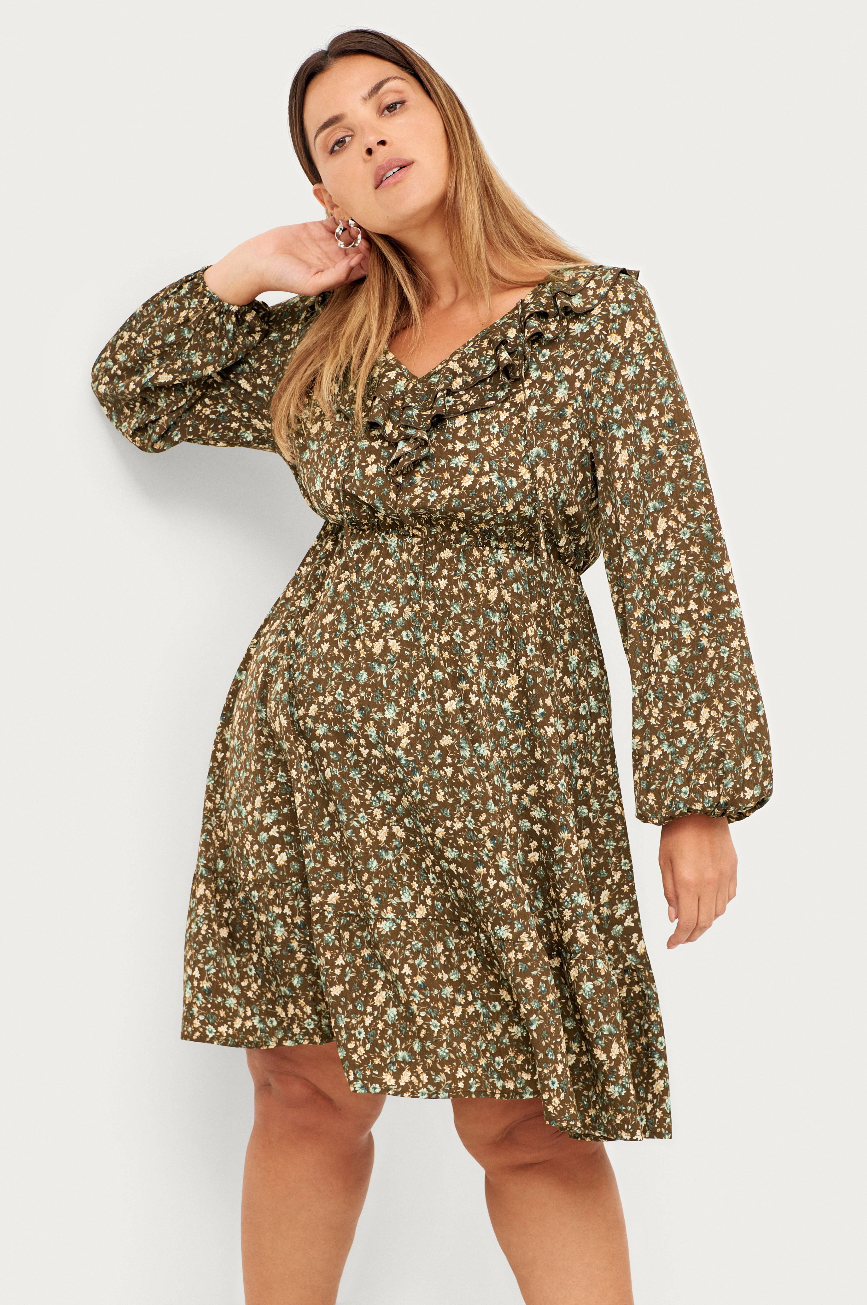 • V-hals snitt med volang og knytbar tråd foran • Lange ballongermer med elastiske mansjetter • Elastisk midje • Volang på bunnen • Lengde: 103 cm i størrelse 42/44