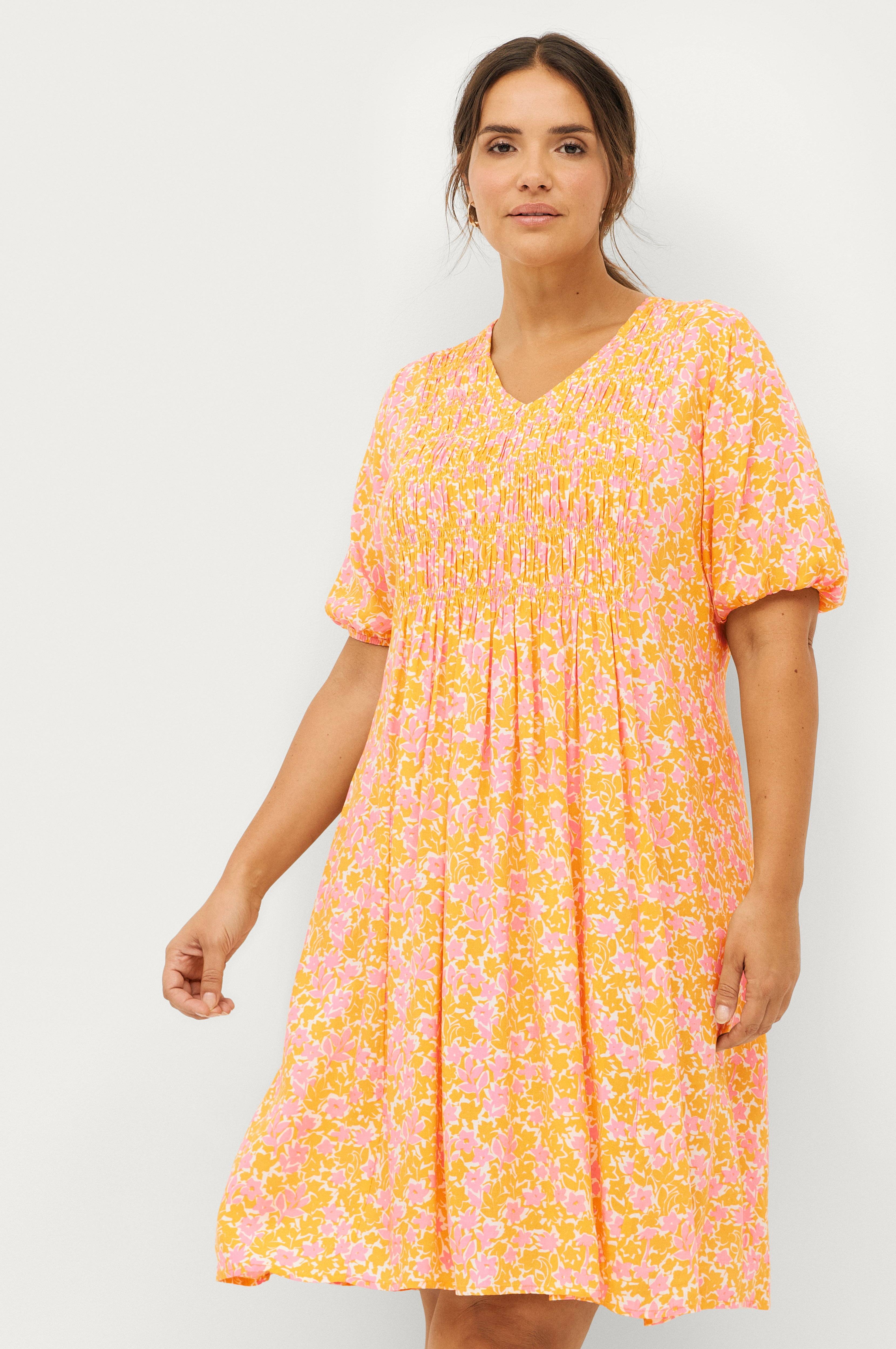 Fargerik og behagelig viskose kjole med smokk. 160 cm, 80kg til 42-44 perfekt Det går rett under knærne. Man blir strålende fornøyd med det.