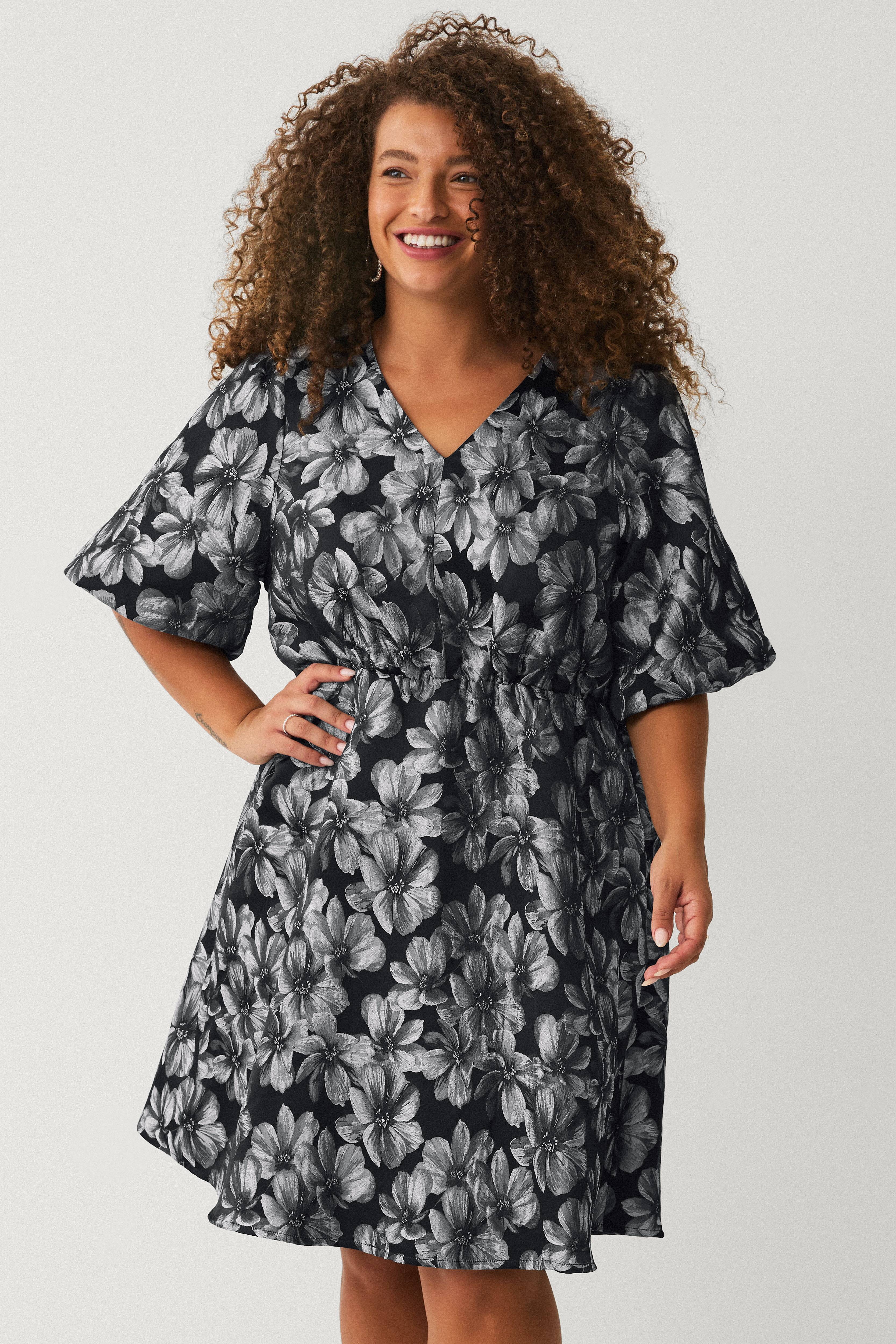 • Kjole i taft med sølvaktige blomster rundt • V-formet hals • Halvlange ballongermer • Elastisk utskjæring ved midjen • Glidelås i siden • Vevd innsidefôr • Lengde: 104 cm i størrelse XL