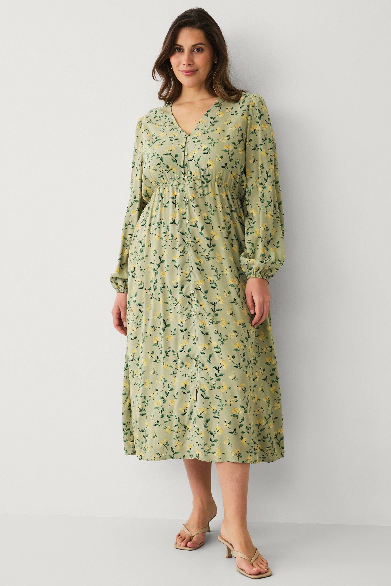• Luftig kjole i viskose • V-hals snitt • Lange ballongermer • Gummistrikk ved midjen • Knappelukking • Normal passform • Lengde: 128 cm i størrelse XL