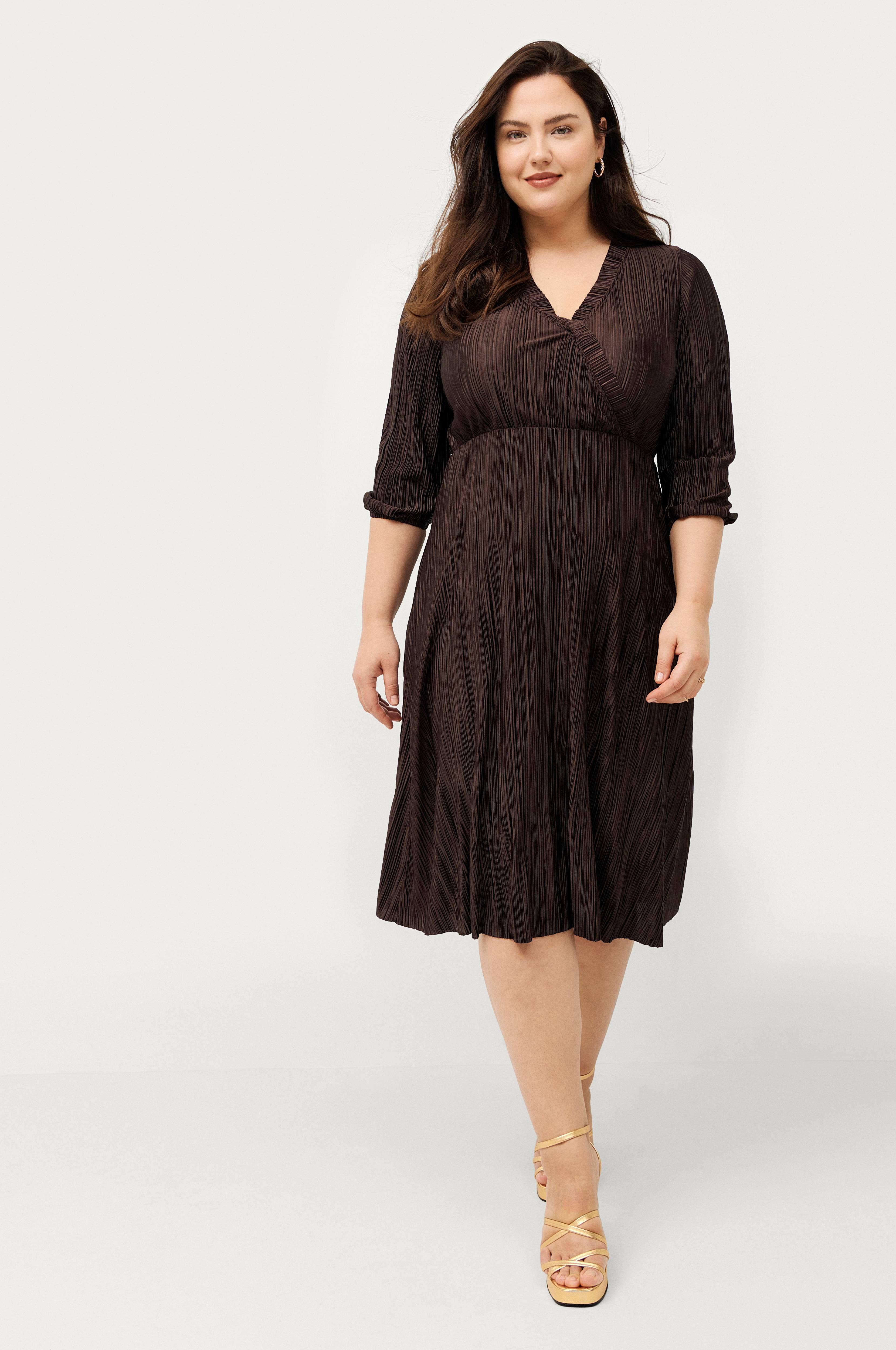• Overlappdesign på toppen • Armer 3/4 lang med elastiske mansjetter • Elastisk midje • Laget av plissert tricot med lysskinn • Lengde: 117 cm i størrelse 42/44