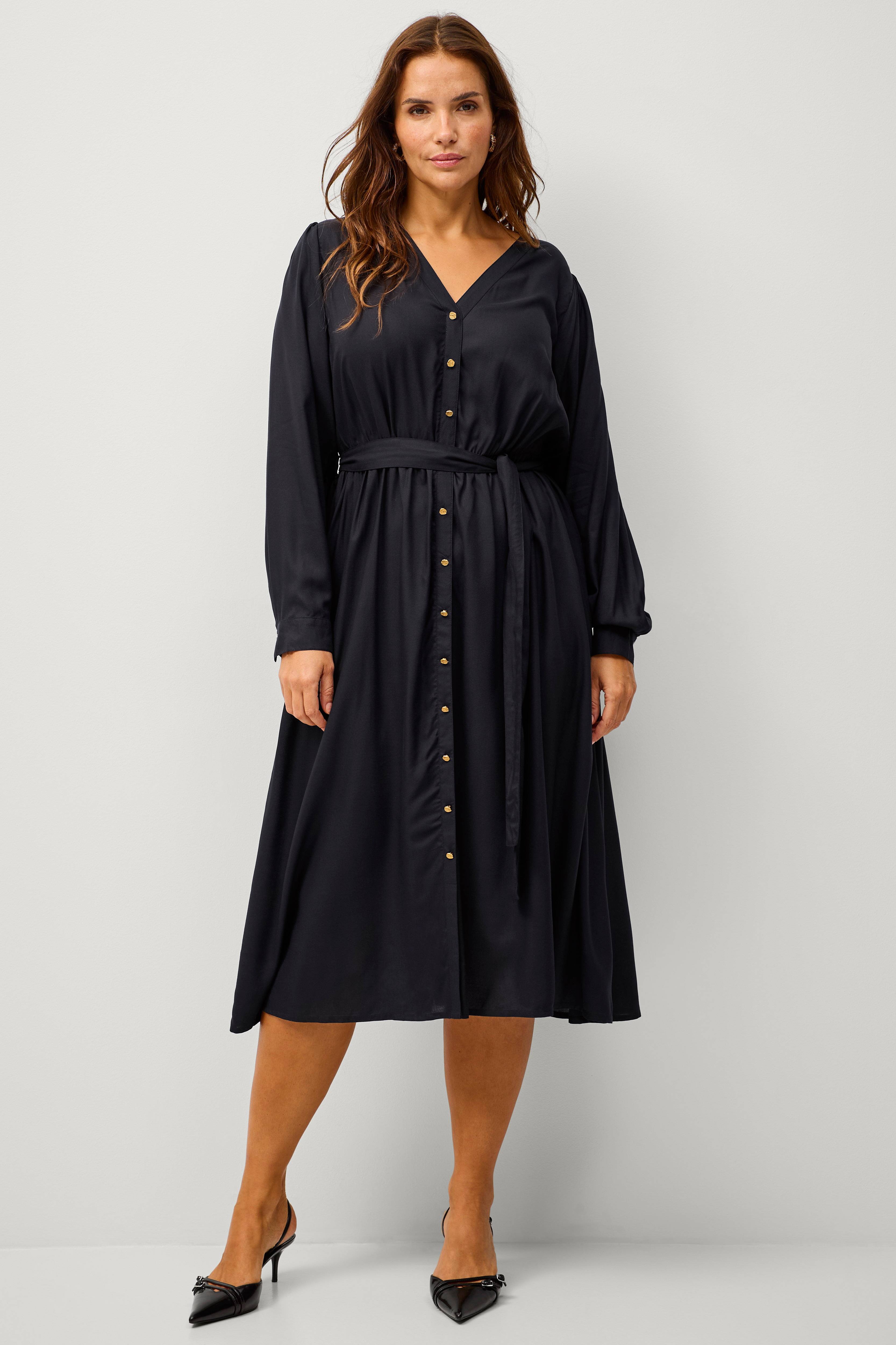 • V-hals snitt• Elastisk midje med knytbart belte• Lange ermer med mansjett• Gullfargede knapper foran• Lengde: 124 cm i størrelse XL