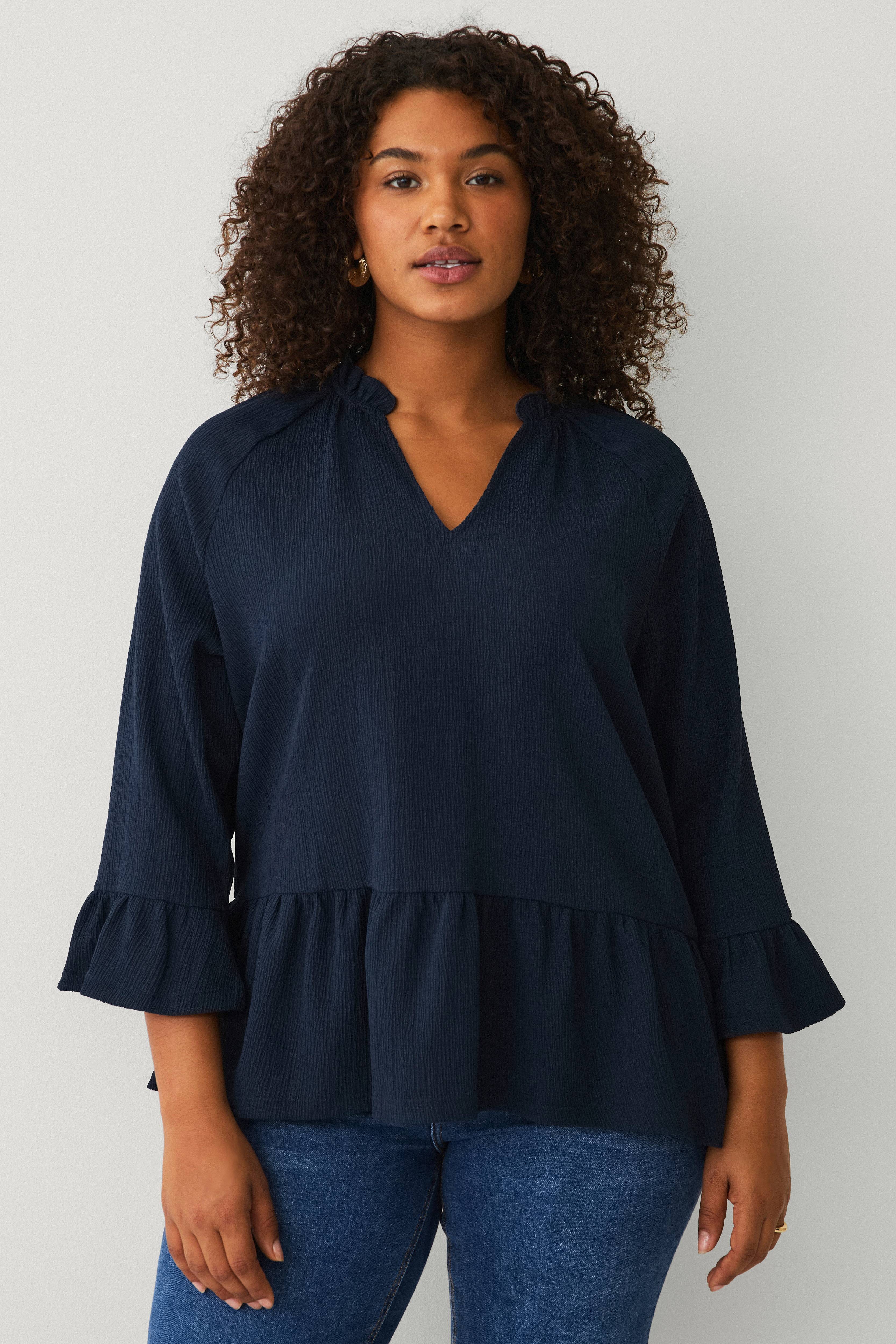 • Topp i mønstret materiale • V-formet hals • Ermer 3/4 lang • Volanger rundt halsen, i ermeslutten og i nedre kant • Plusstørrelser • Lengde: 70 cm i størrelse XL