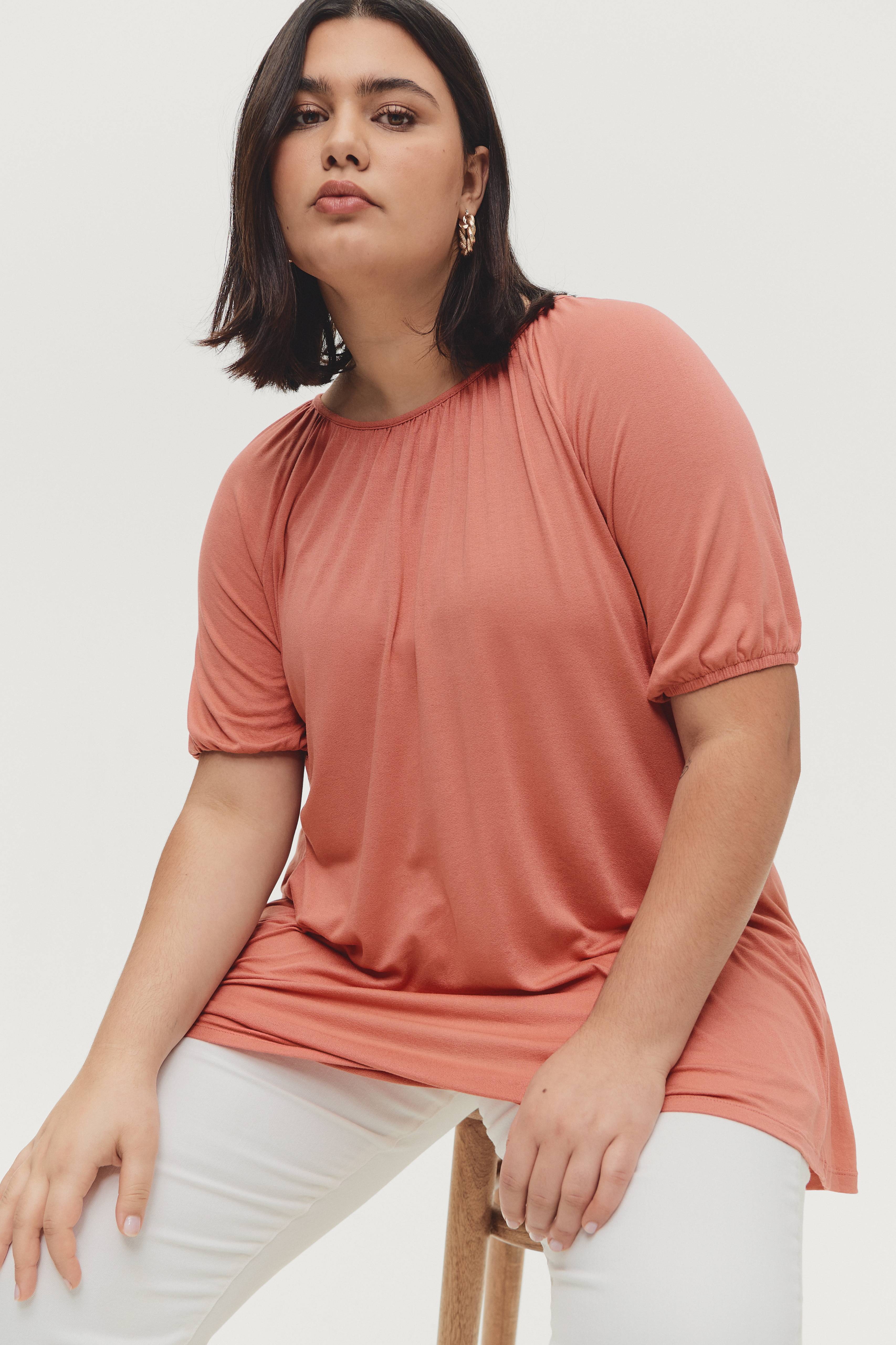 Tunika Bianka i myk viskosetrikot med rund hals med rynker, og korte ermer med elastiske ermekanter. Ledig passform. Lengde ca. 82 cm i str 42/44.