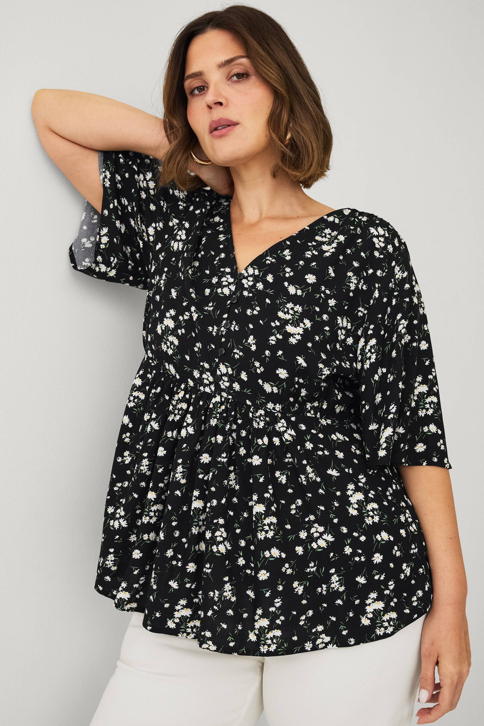 • Tunika i viskose med trykket mønster • V-formet hals • Korte draperte volangermer • Knapper ned til midjen • Utskjæring ved midjen med rynkeeffekter • Lengde: 74 cm i størrelse 46/48