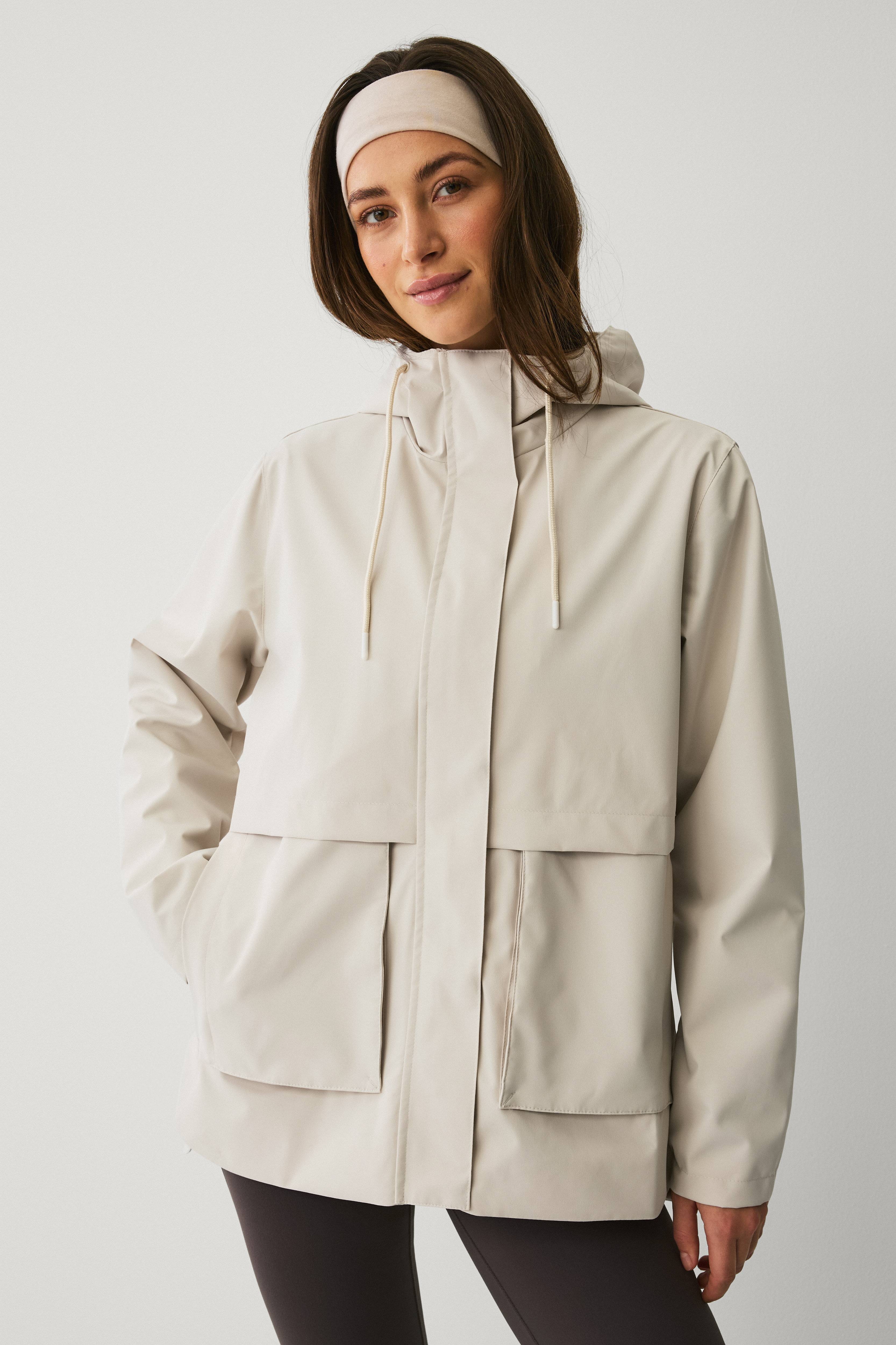 • Kort, ufôret jakke • Vannavstøtende materiale • Fast, justerbar hette • Glidelåslukking • Klafflomme over glidelåsen med trykknapper • To sidelommer med glidelåslukking • Gummistrikk i ermeslutten • Ventilerende mesh i ryggen • Avrundet hem • Lengde: 72 cm i størrelse S