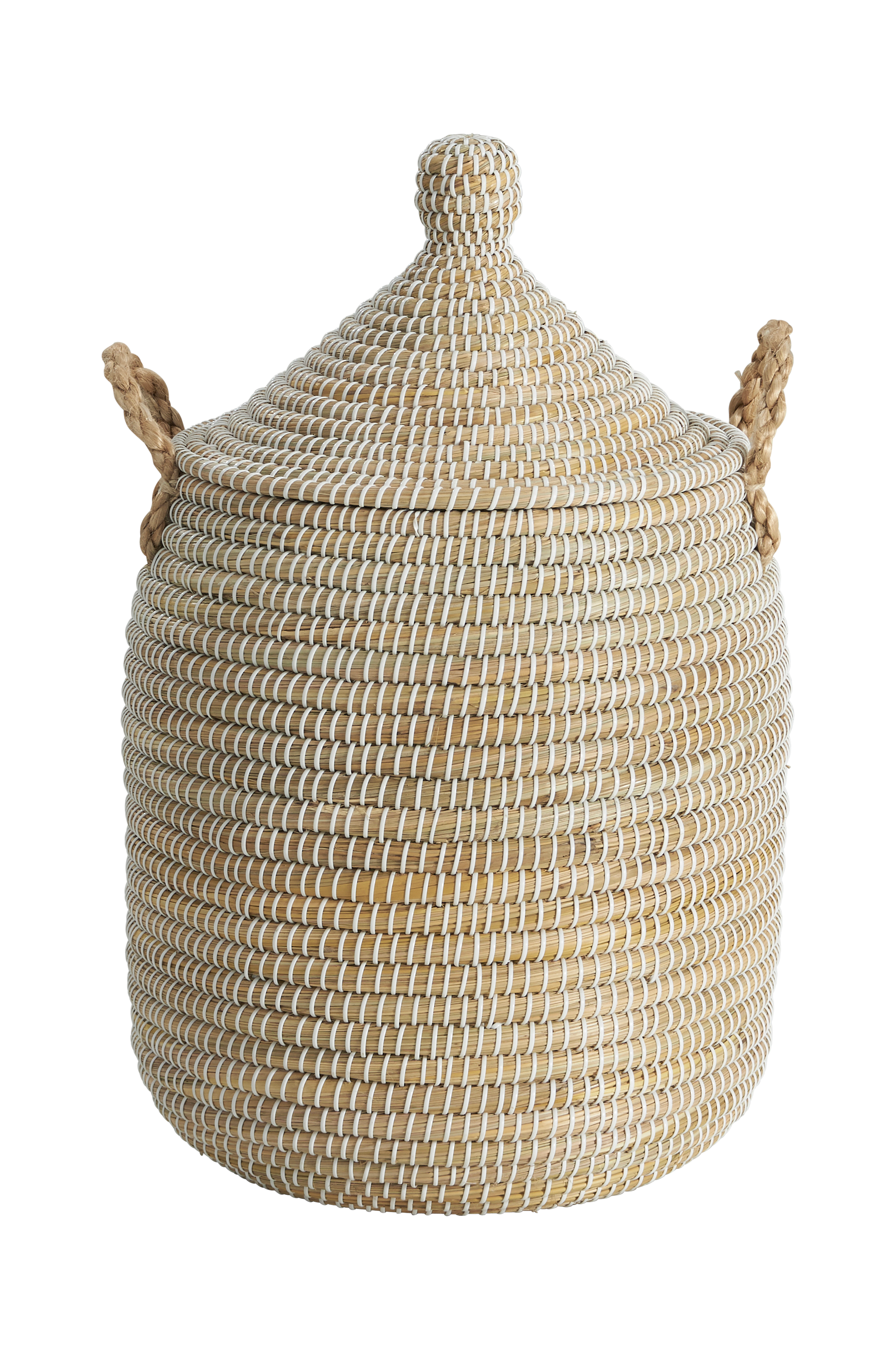 Håndflettet kurv av sjøgress med bånd av plast. Høyde uten lokk ca. 45 cm, med lokk ca. 70 cm, Ø ca. 35 cm. Alle mål er cirkamål da produktet er håndlaget. Variasjoner mellom 3-5 cm i størrelse og form kan forekomme.