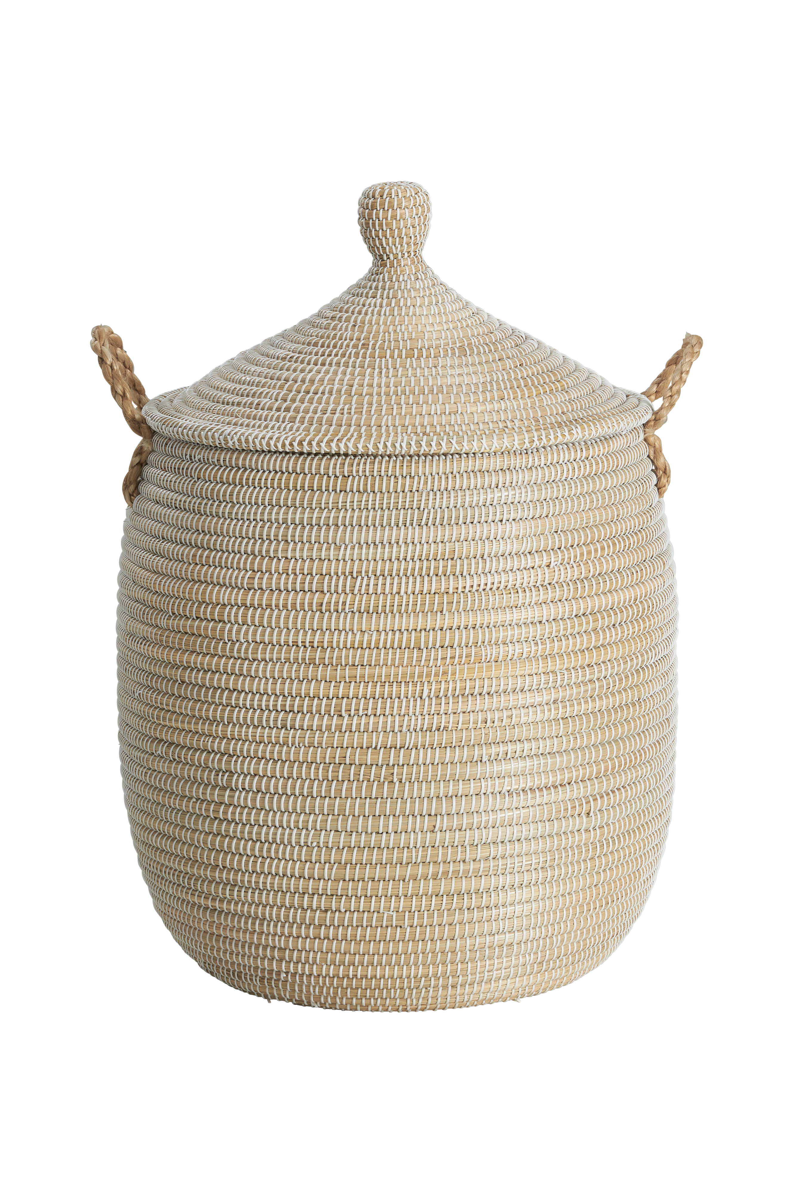Håndflettet kurv av sjøgress med bånd av plast. Høyde uten lokk ca. 60 cm, med lokk ca. 90 cm, Ø ca. 52 cm. Alle mål er cirkamål da produktet er håndlaget. Variasjoner mellom 10-20 cm i høyde og form kan forekomme.