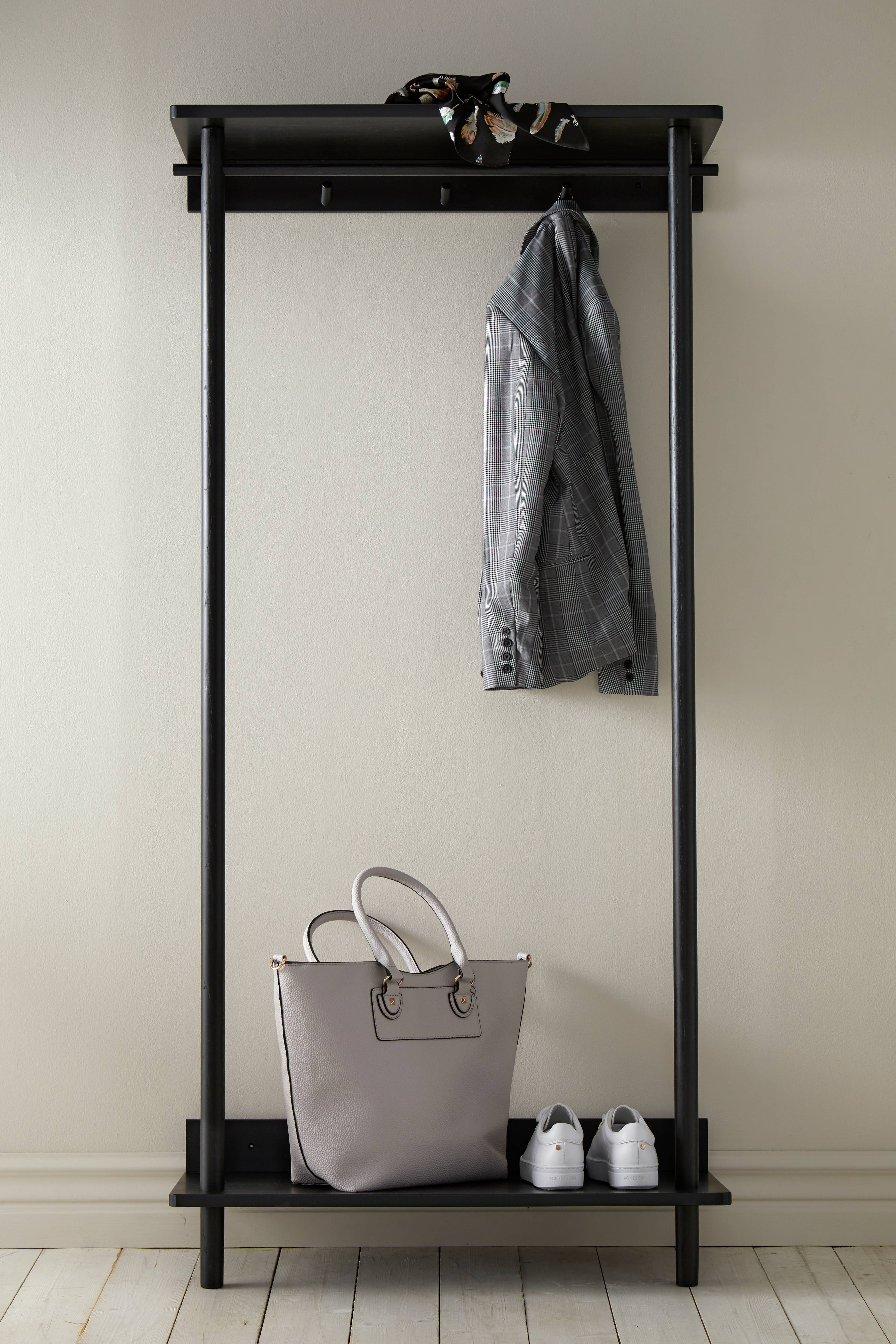 Oppbevaring for gang med skohylle, hattehylle og 5 kroker. Av oljet eik. Høyde 170 cm, dybde 34 cm, bredde 80 cm. Høyde fra gulvet til første hylle 13 cm. Leveres umontert.
