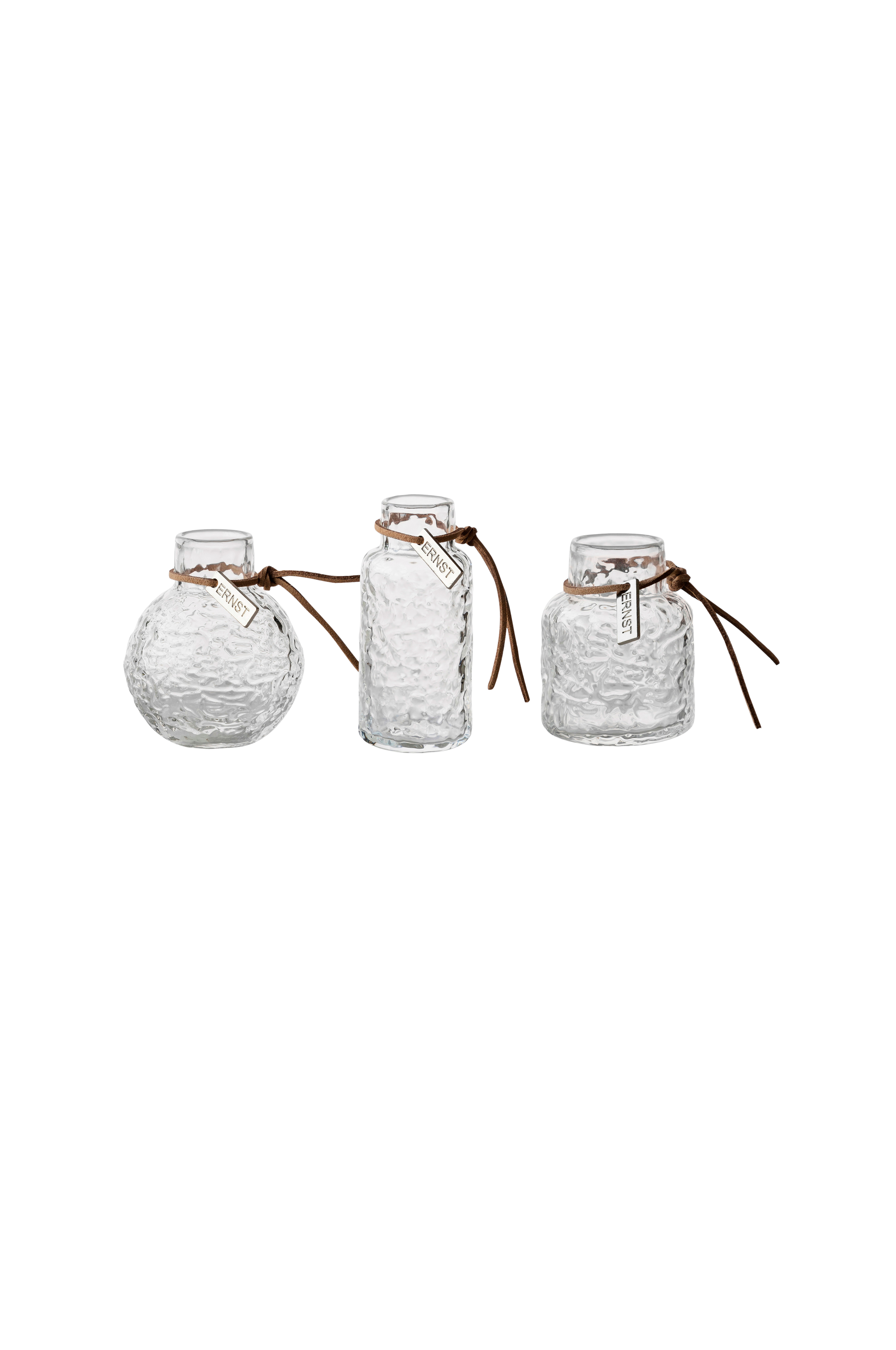 Tre små, strukturerte Ernst vaser i en gaveeske - en gave til deg som setter pris på det lille ekstra. Perfekt til å la et par enkle blomster stå i sentrum, som skjærevase eller som en vakker detalj i seg selv.