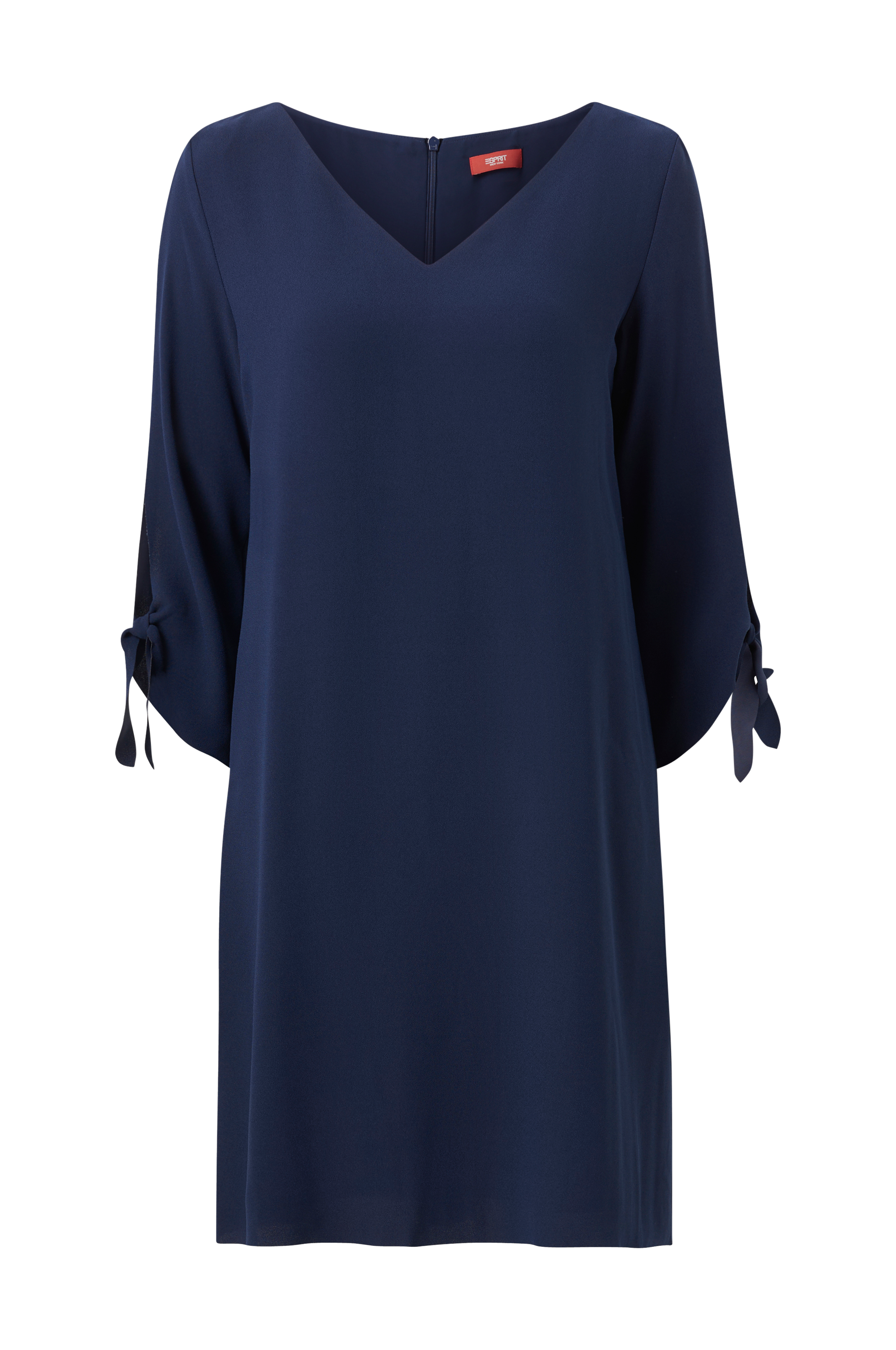 Kjole fra Esprit. Lett utsvingt modell i vevd crêpekvalitet. V-utringet hals med skjult glidelås i ryggen og 3/4-lange ermer med splitt og knyting i ermekantene. Diskré, ufaldede kanter. Lengde ca. 95 cm i str S.