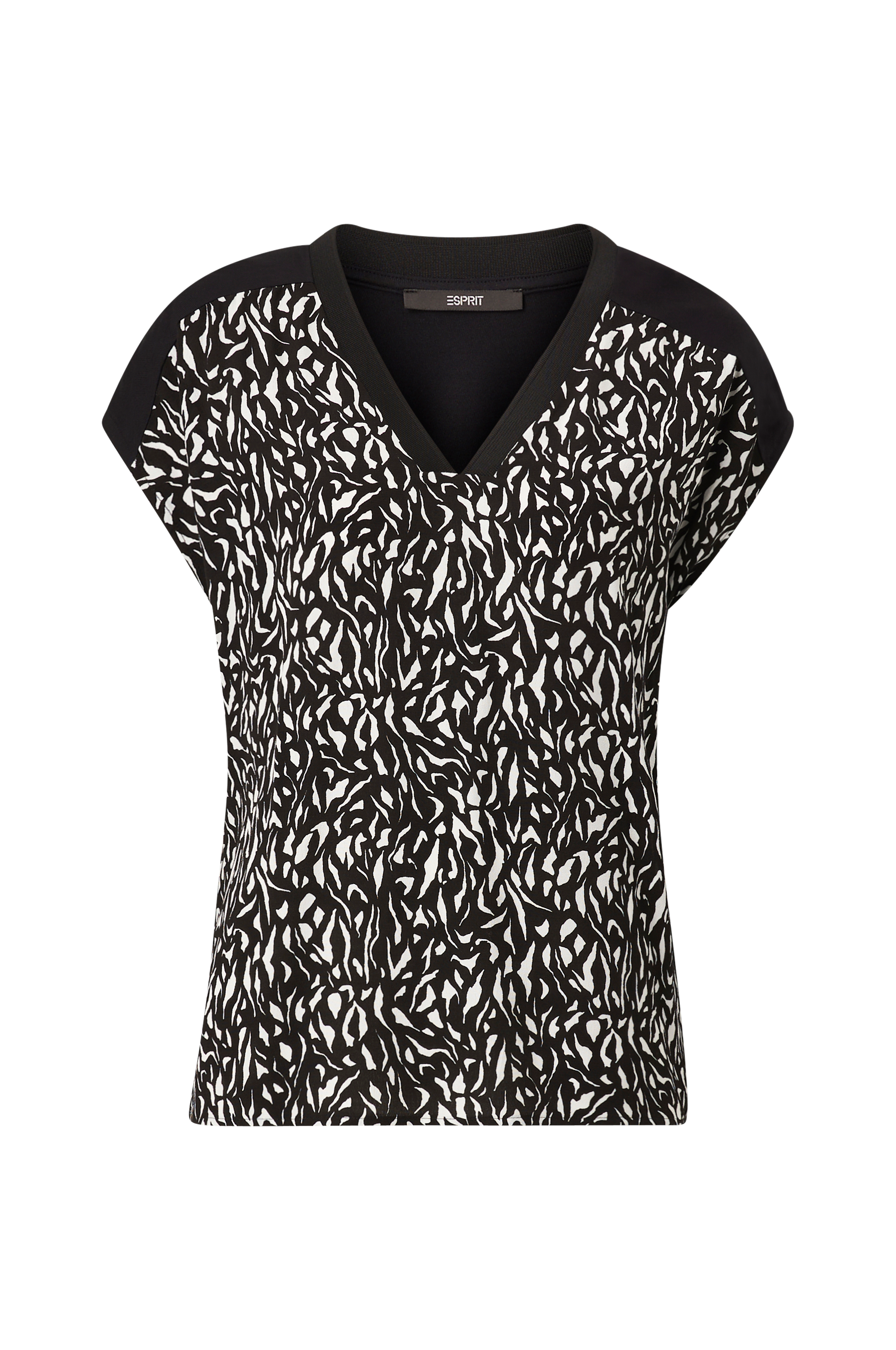 Trikottopp med vevd, mønstrete forstykke. V-utringet hals med vrangbord. Lave skuldersømmer og korte ermer.