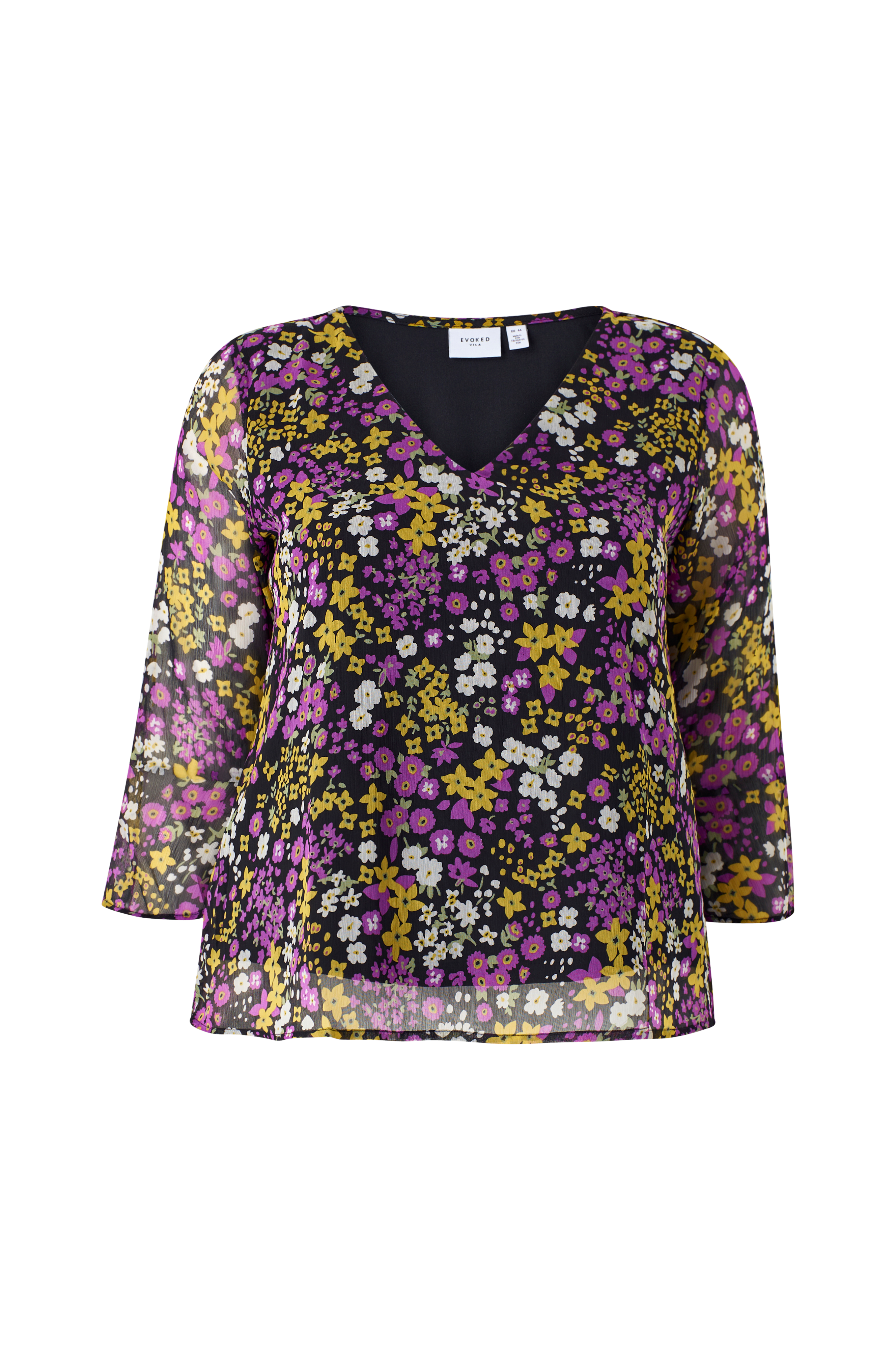 • Bluse i chiffon• V-hals snitt• Trompetermer 3/4 lang• Trikotfôr• Plusstørrelser
