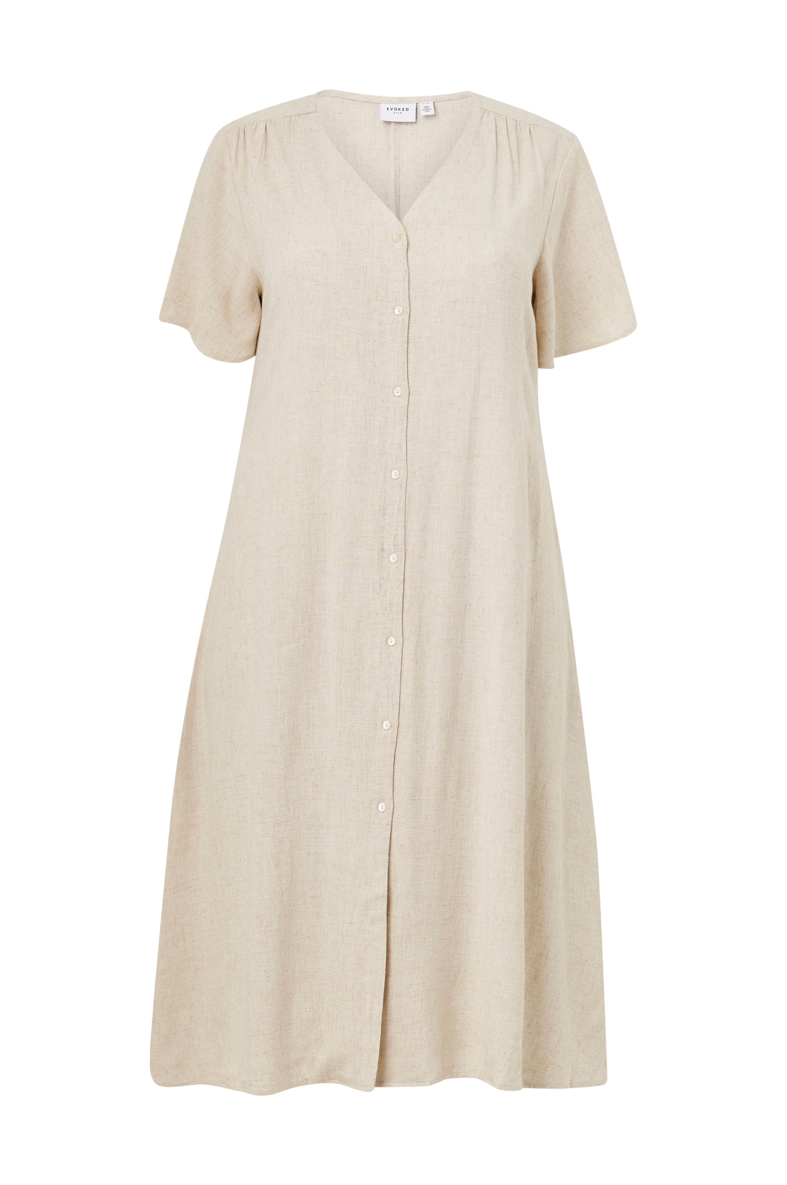 • Kjole i linmiks• V-hals snitt• Knapper foran• Korte draperte volangermer• Plusstørrelser• Lengde: 118 cm i størrelse 44