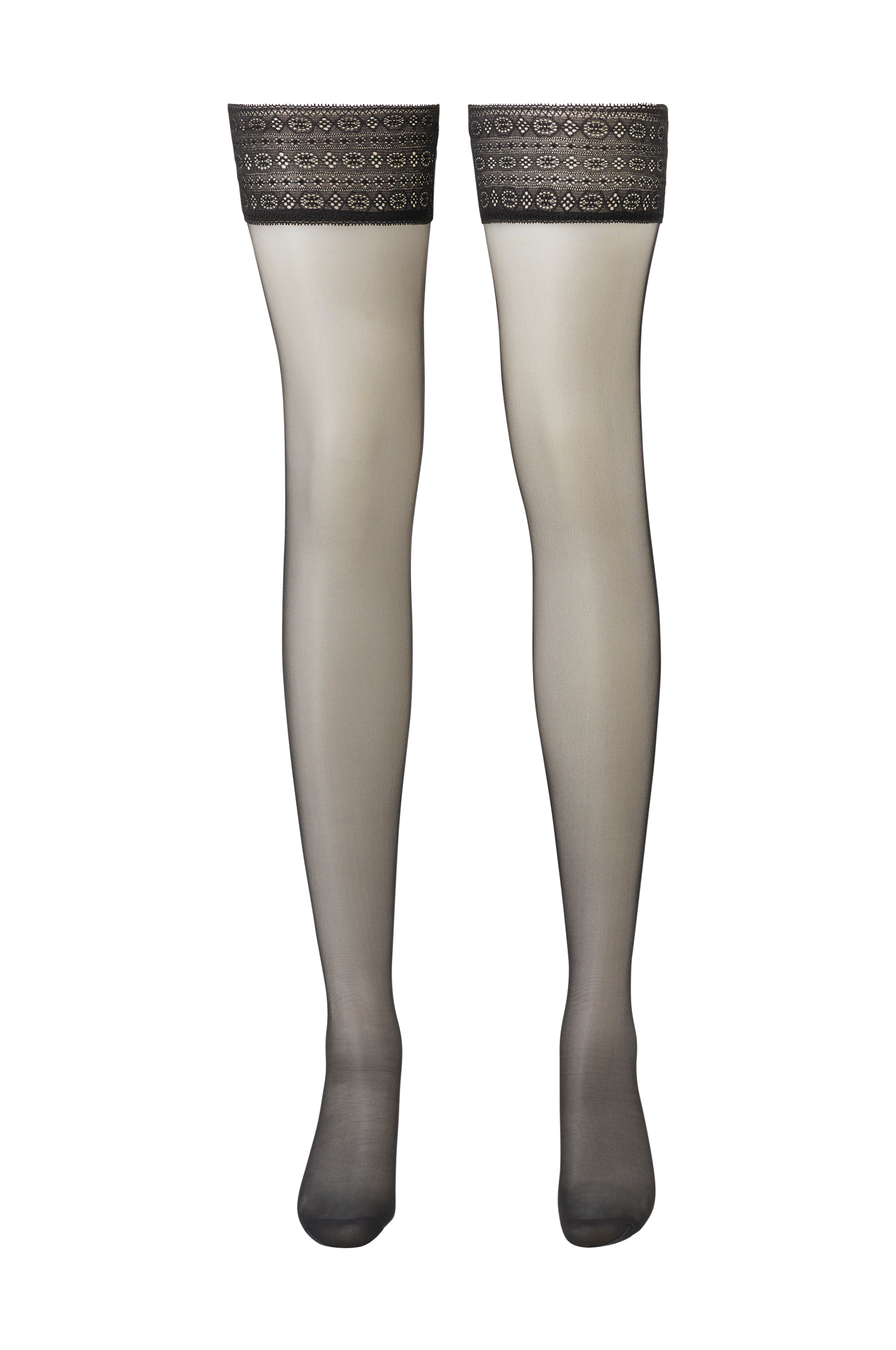 Tynne ‘stay ups' med silkemyk følelse. Behagelig tåsøm og glifri blonde med innvendig silikon øverst.