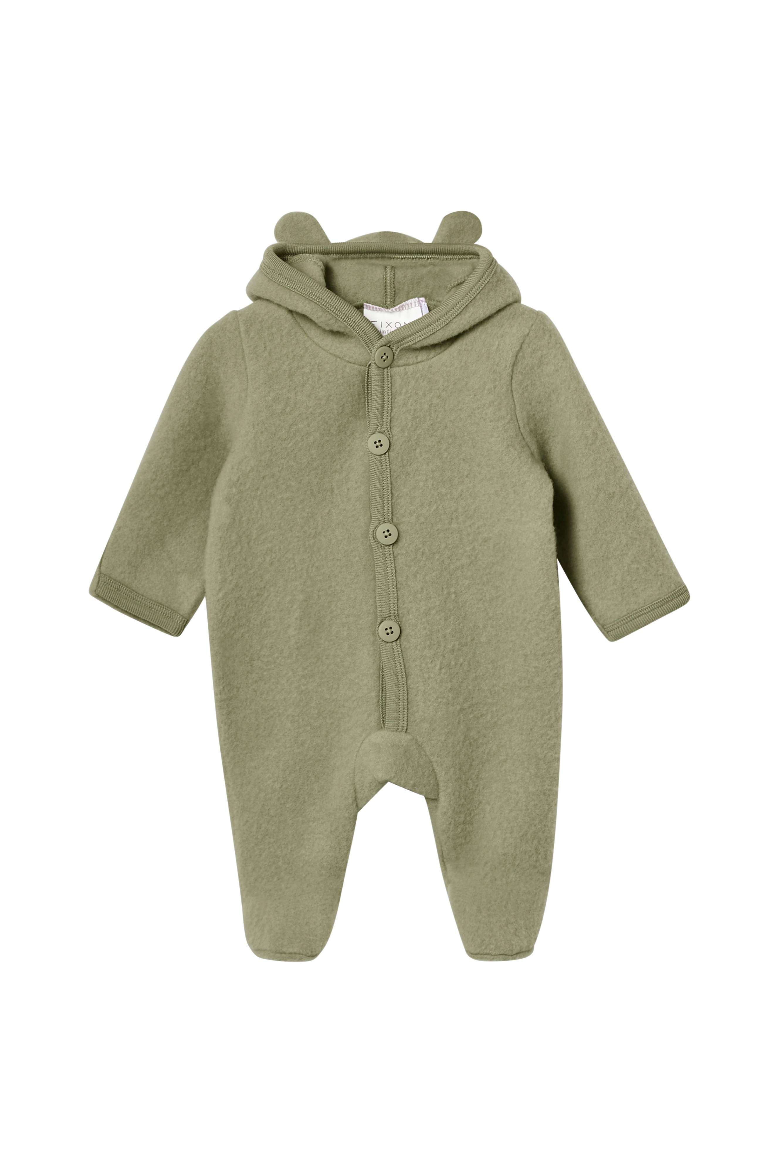 Ulldress Hush Wool Wholesuit fra Fixoni. Dressen er fremstilt i svært myk og deilig ull og har en hette med påsydde «ører». Knapper foran, overbrett i ermekantene og hel fot.