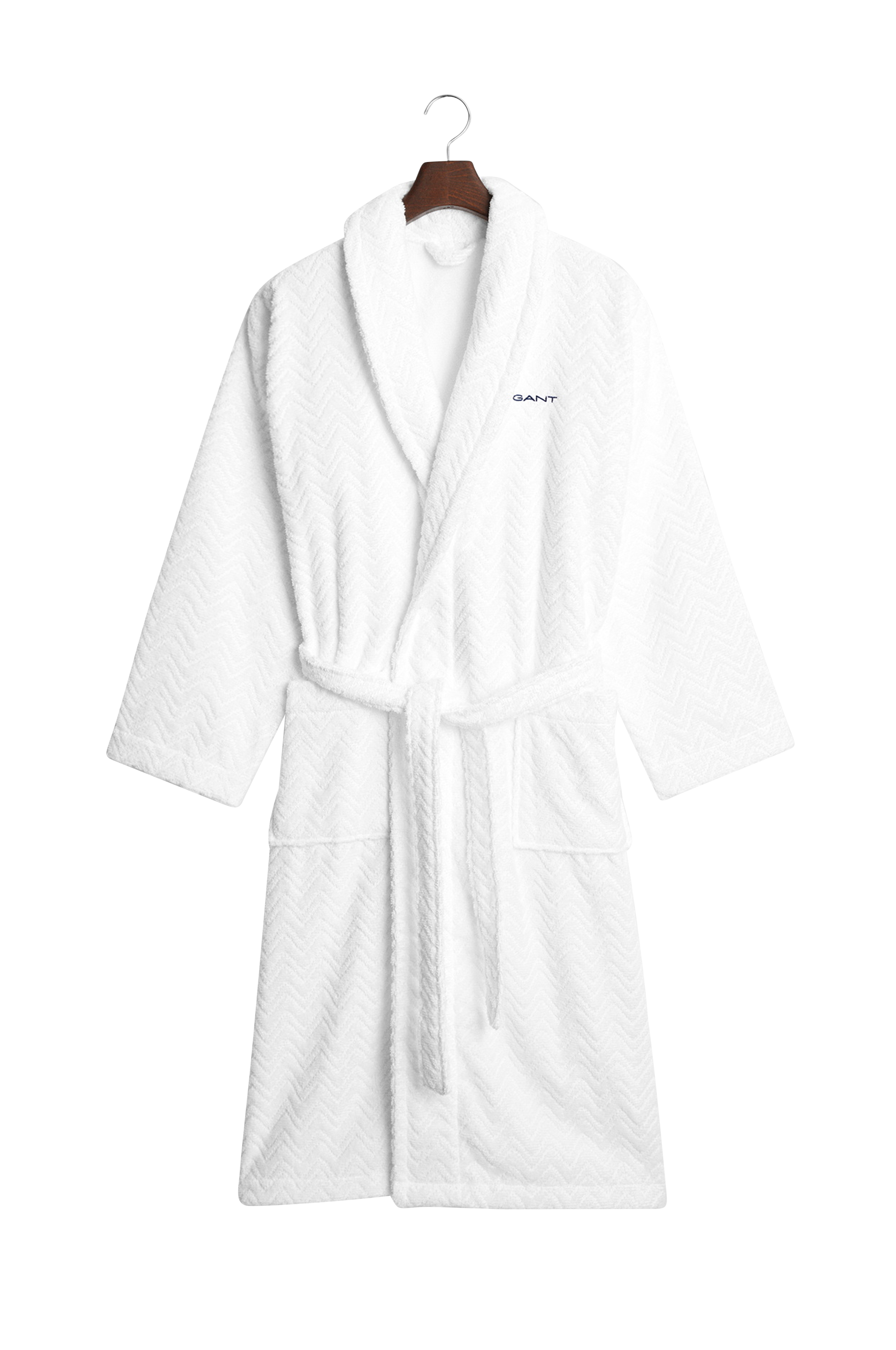 Denne morgenkåpen fra Gant er laget av 100 % økologisk bomull i behagelig frotté. Kåpen har et sildebensmønstret jacquardmønster, er designet for en unisex-passform og har en tykk krage, belte i midjen og to lommer foran.
