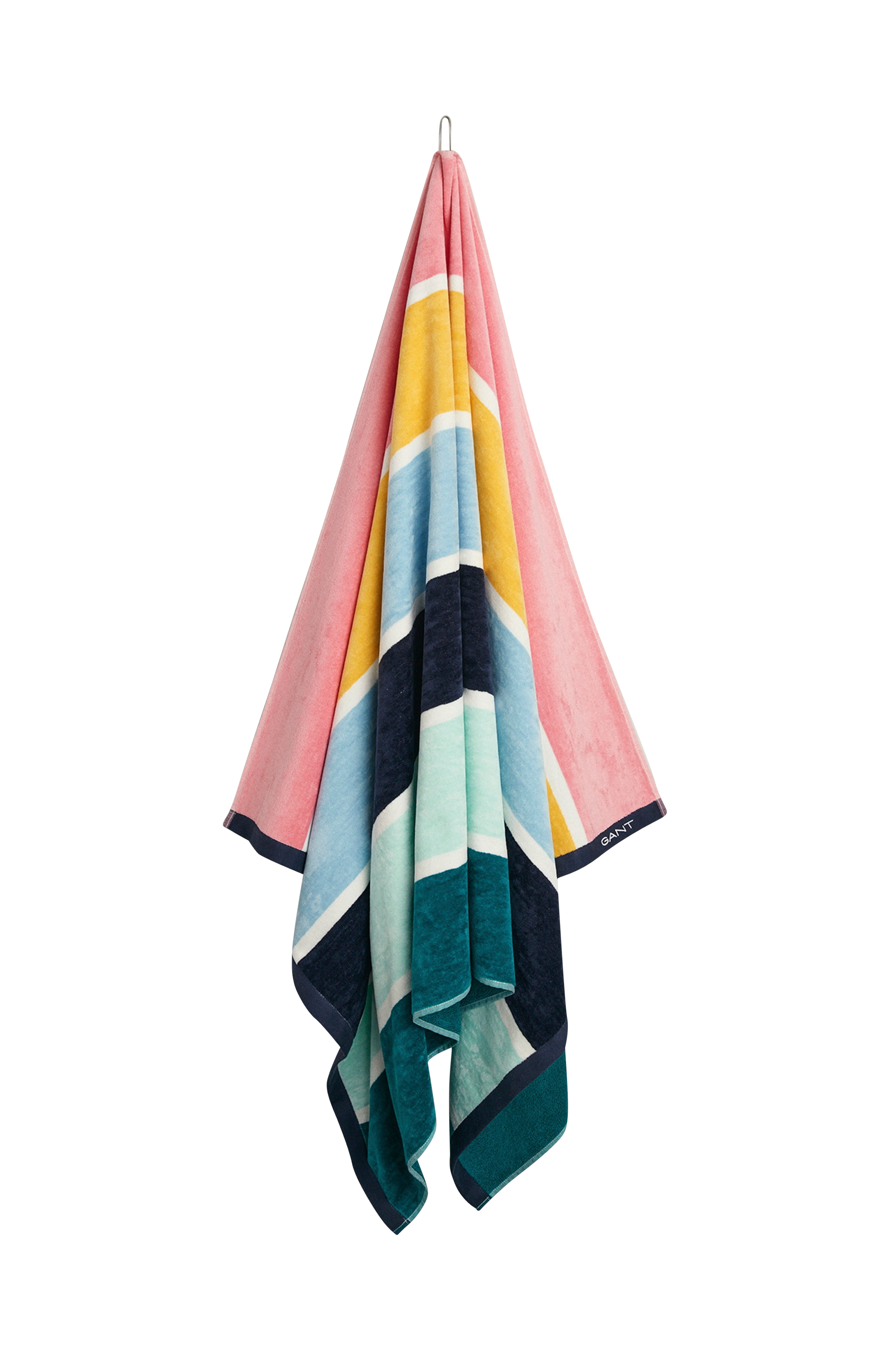 Dette strandhåndkleet har et heldekkende, bredstripet mønster, er laget av sertifisert økologisk bomull og har en absorberende og tykk vekt på 500 g/m2. Håndkleet har et vendbart design med en side i myk velur og en side i frotté, og er det perfekte sommertilbehøret for bassengdager, stranddager og mye mer.
