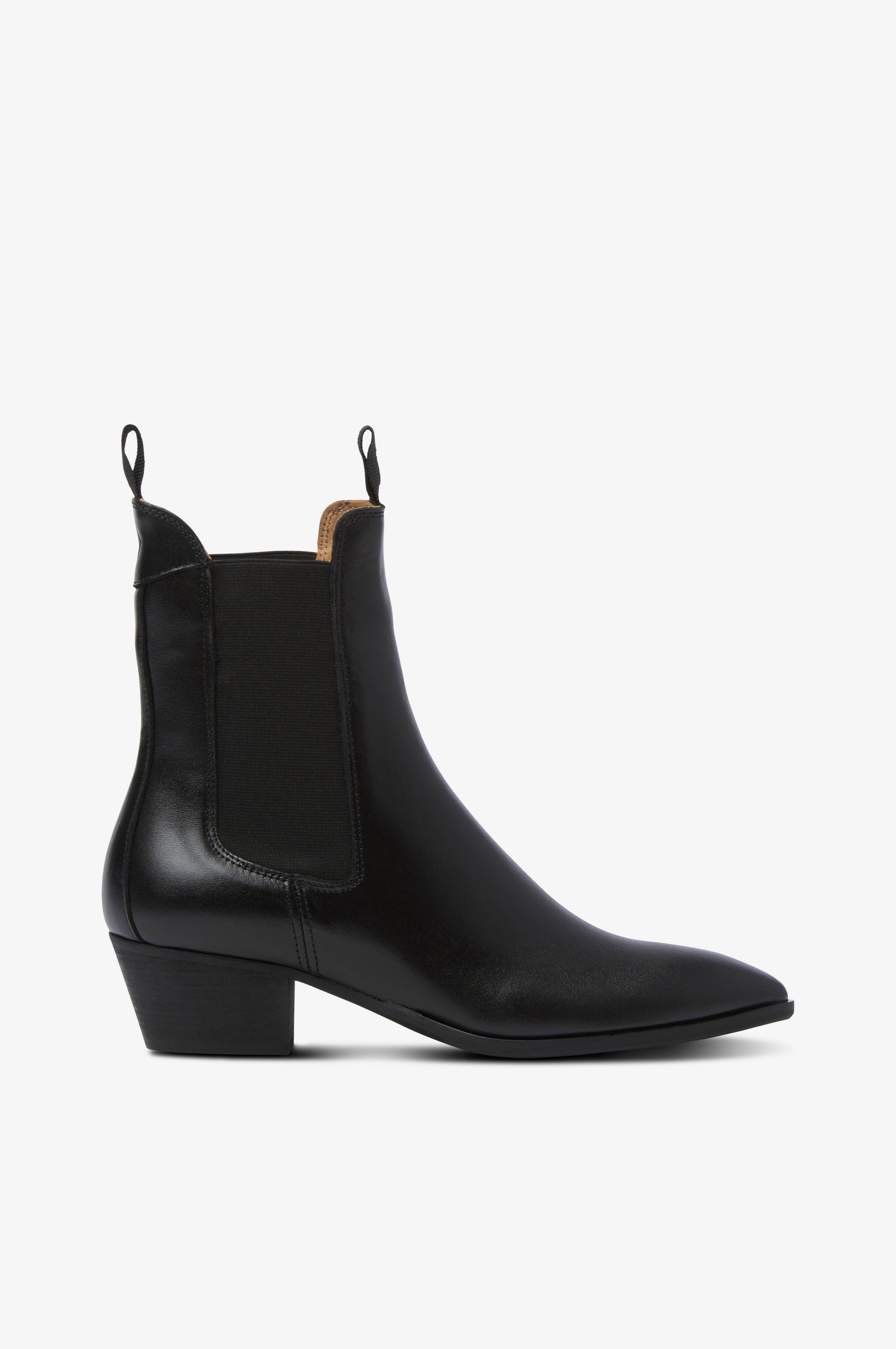 • Boots i skinn• Spiss tåform• Elastiske paneler på begge sider av skaftet• To vevde trekksnorer• Foring i skinn og tekstil• Yttersåle i gummi• Skafthøyde: 16,5 cm i størrelse 37• Hælhøyde: 4,5 cm
