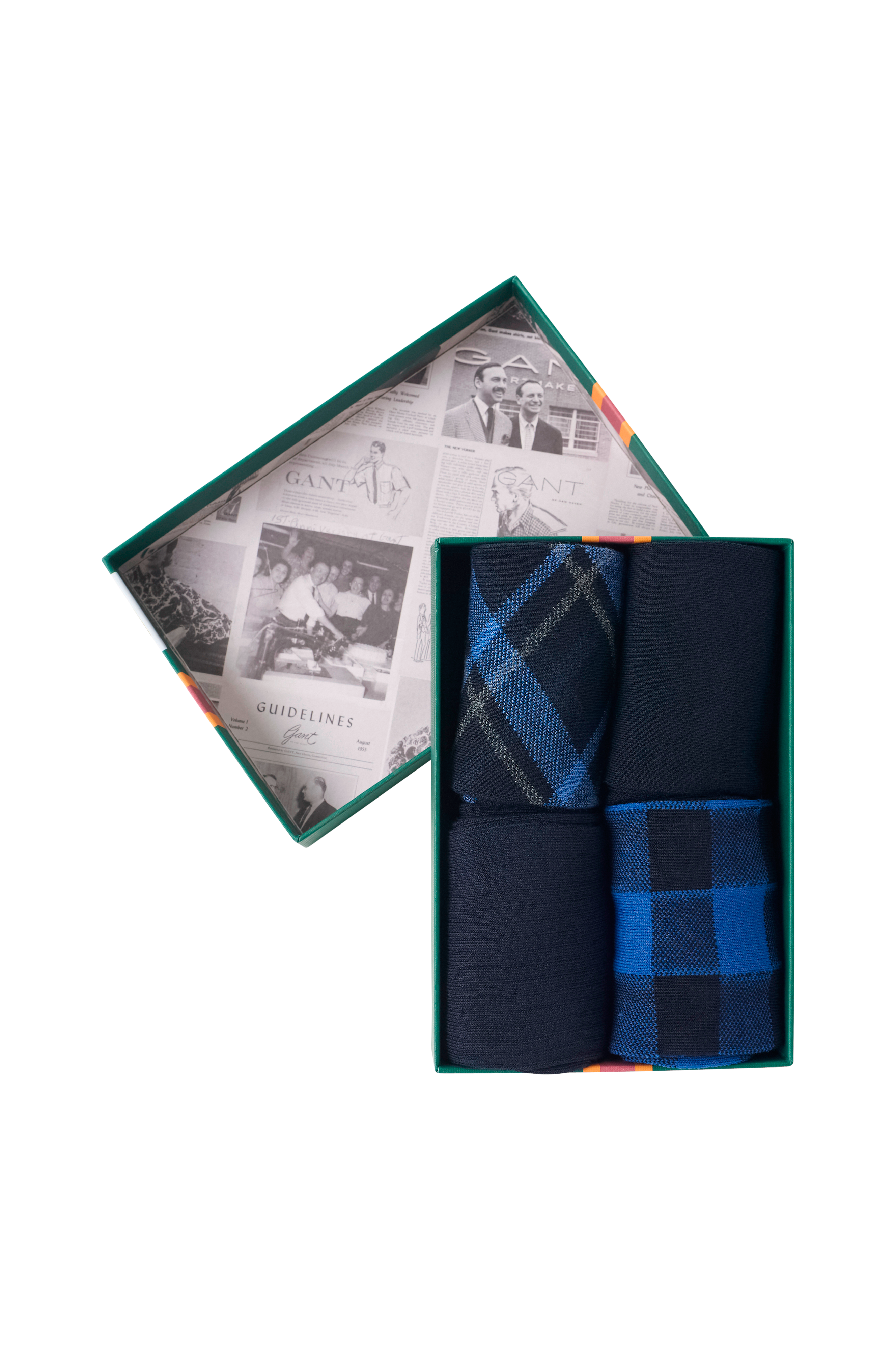 En gaveinnpakket firepakning med sokker i myk, kjemmet bomull som slutter midt på leggen. Pakken inneholder to ensfargede par - ett i ribbestrikket design og ett i ensfarget strikk. Pakken inneholder også to par i ulike rutemønstre. Alle sokkene har en intarsiastrikket Gant-logo under foten.
