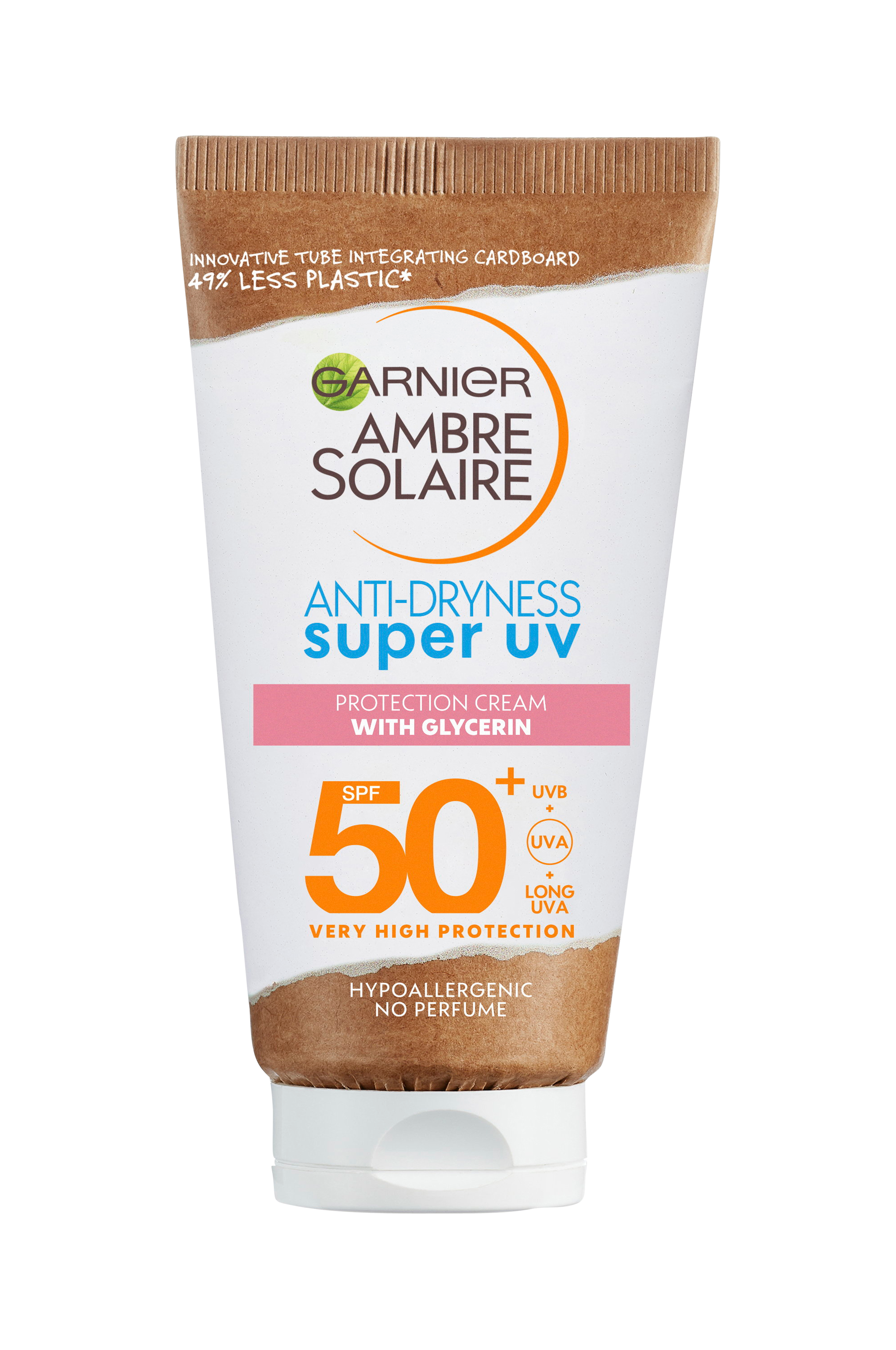 Garnier Ambre Solaire Anti-Dryness har svært høy solfaktor med SPF50+ i en glyserolberiket ansiktskrem.