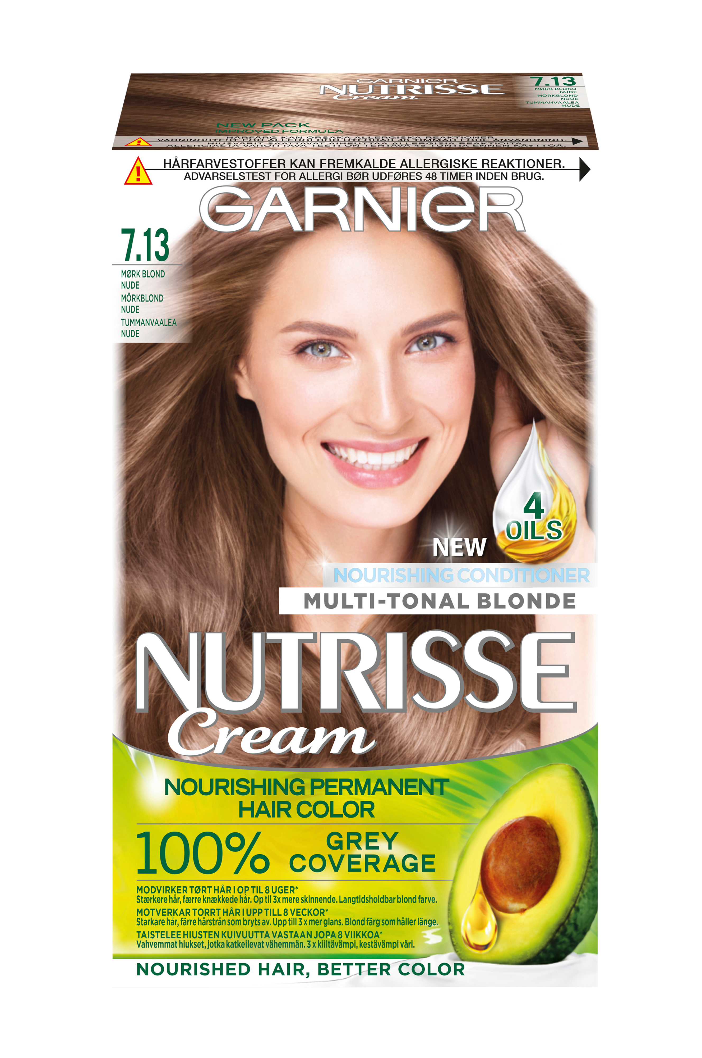 Nutrisse Cream er en permanent hårfarge som er beriket med fruktoljer. Nutrisse er den første hårfargen som gir næring til håret samtidig som det farges. Den pleiende etterbehandlingen med avokado gjør håret mykt og smidig. Hårfarging kan forårsake alvorlige allergiske reaksjoner. Les og følg bruksanvisningen. Produktet er ikke beregnet til bruk på barn under 16 år.