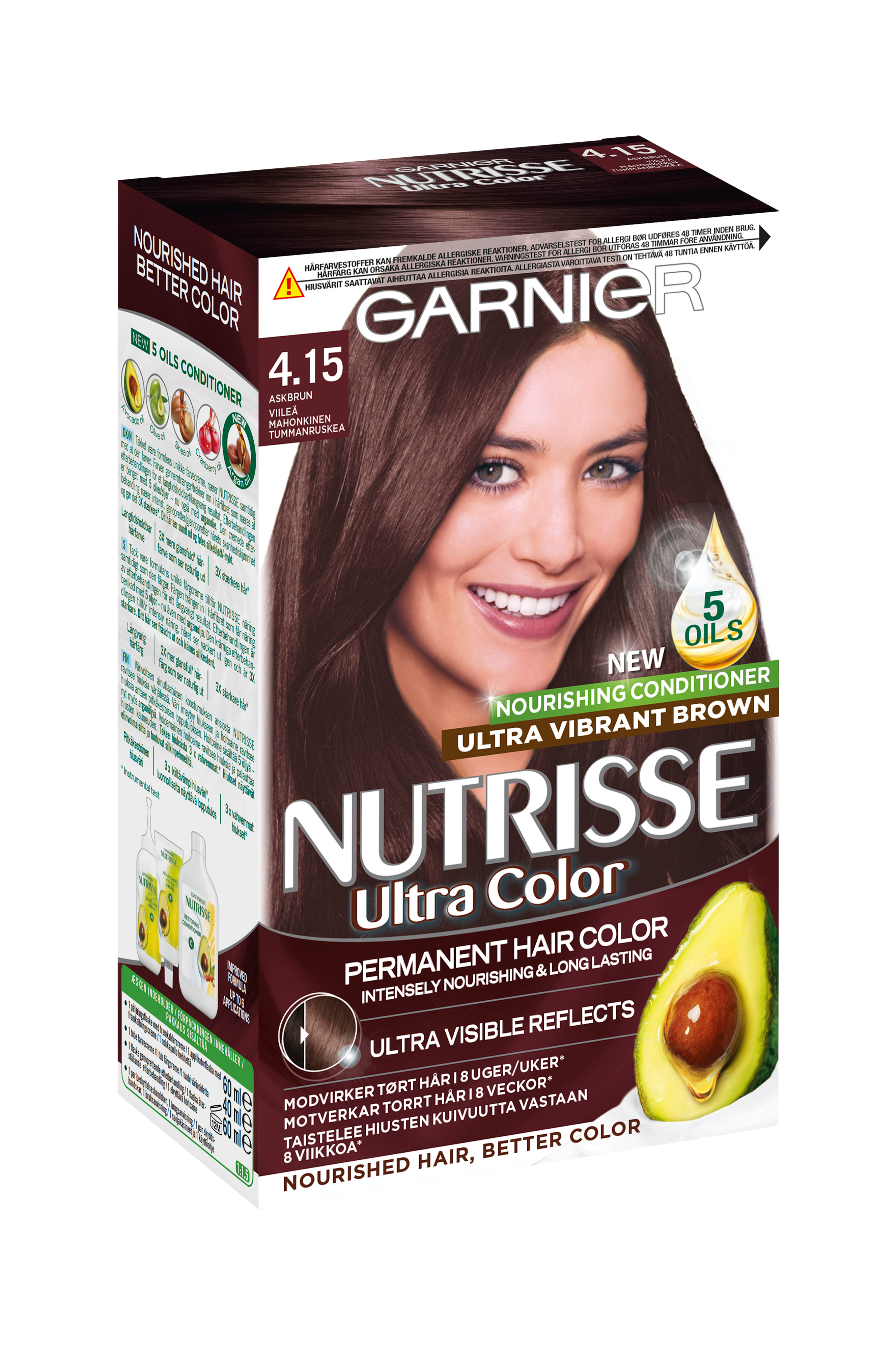 Nutrisse Cream er en permanent hårfarge som er beriket med fruktoljer. Nutrisse er den første hårfargen som gir næring til håret samtidig som det farges. Den pleiende etterbehandlingen med avokado gjør håret mykt og smidig. Hårfarging kan forårsake alvorlige allergiske reaksjoner. Les og følg bruksanvisningen. Produktet er ikke beregnet til bruk på barn under 16 år.