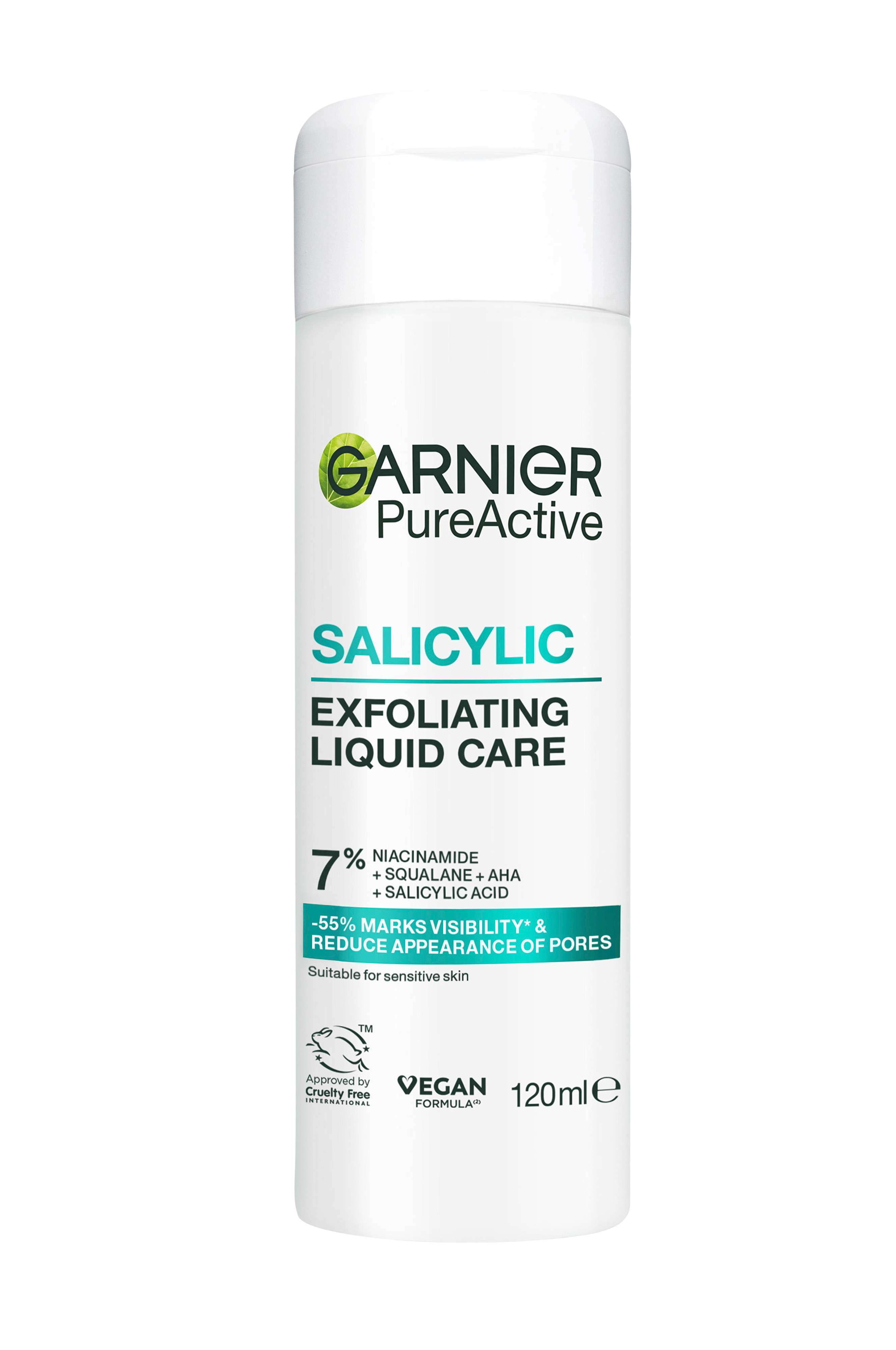 Garnier Pure Active Salicylic Exfoliating Liquid Care er en eksfolierende toner beriket med salisylsyre. Produktet har en skånsomt eksfolierende formel og reduserer merker etter urenheter, synlige porer og ujevn hudstruktur samtidig som den beskytter hudens barriere og gir fuktighet i 24 timer. Formelen trekker rask inn i huden og etterlater den med en glatt finish, uten å føles klissete eller fet. Tetter ikke porene.