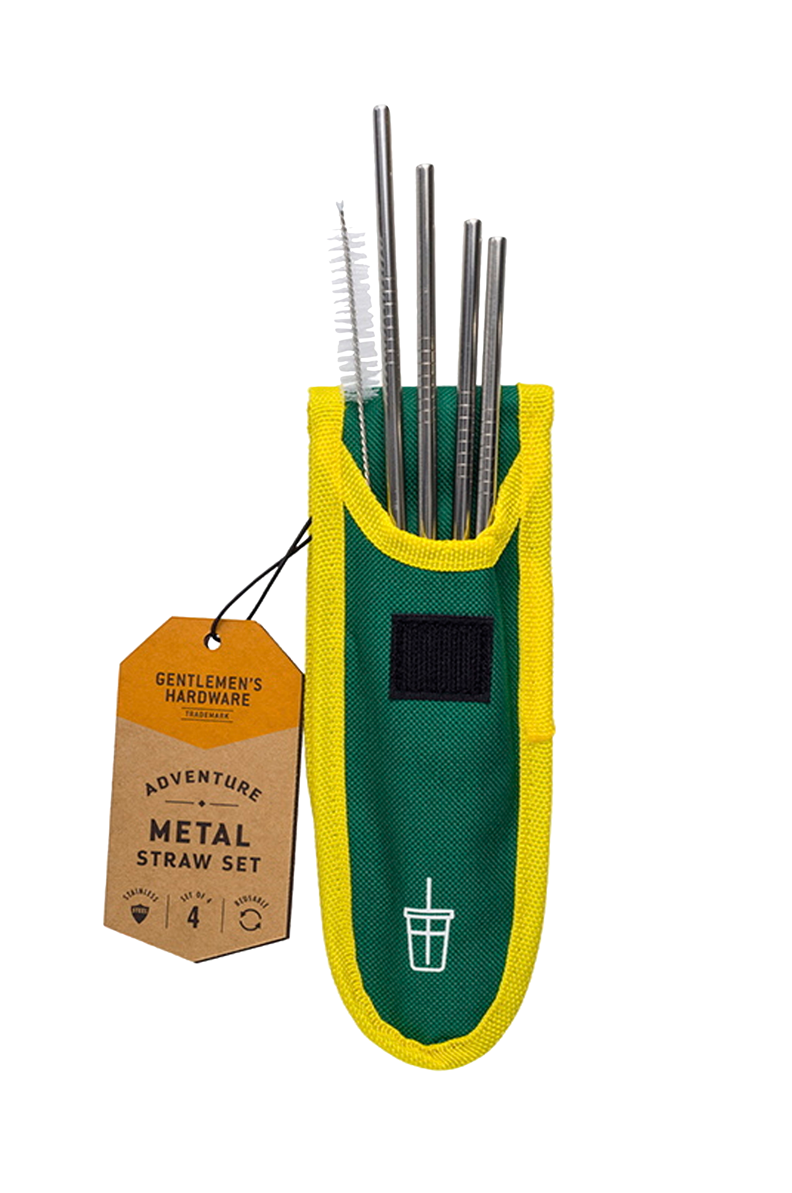 Metallsugerør i et fint reiseetui med karabinkrok, fra gentlemen's hardware!fire metallsugerør og rengjøringsbørste.