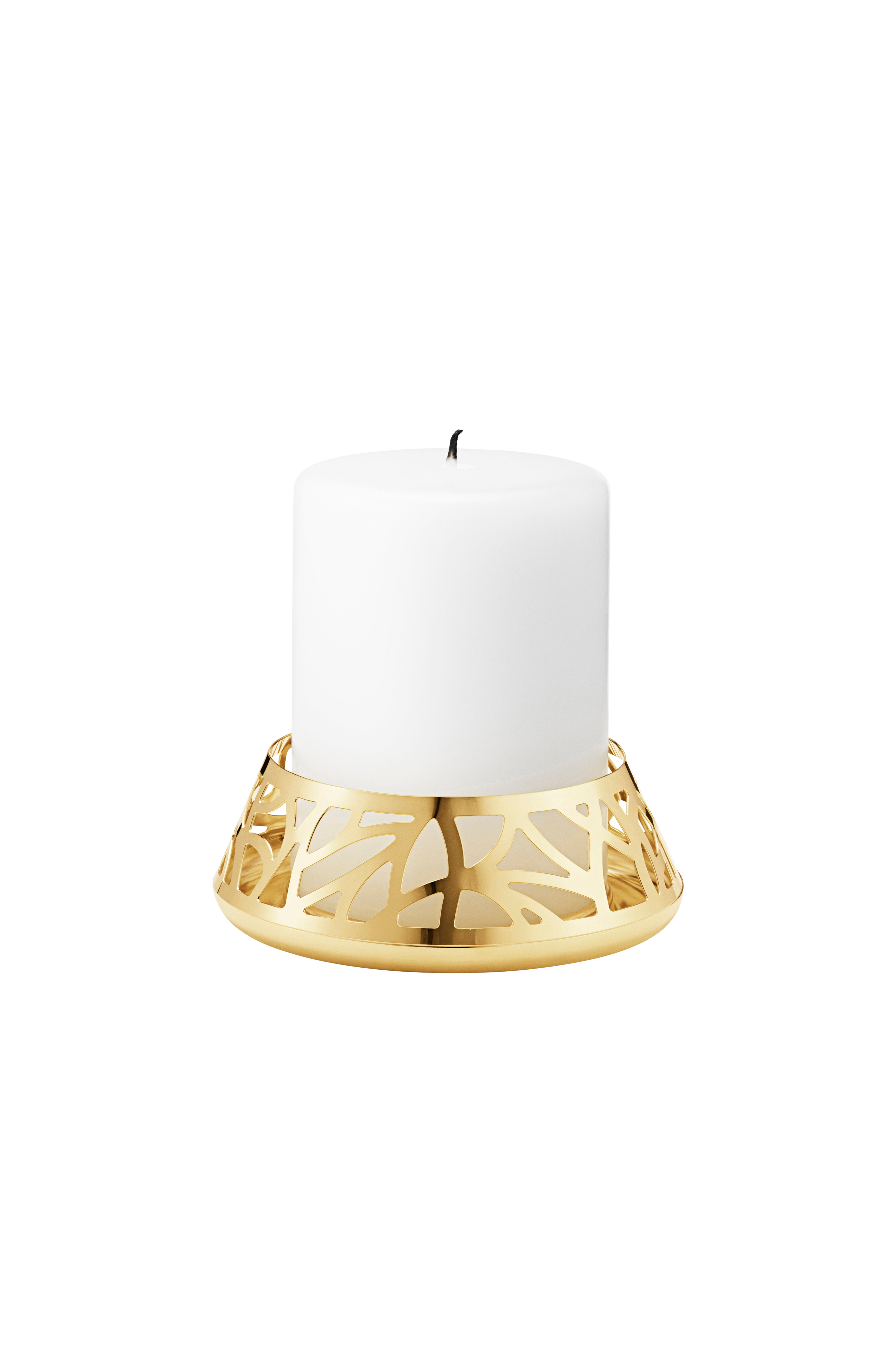 Den elegante lysestaken for kubbelys har et vakkert utskåret mønster som er inspirert av greiner. 2023s julekolleksjon er designet av Sanne Lund Traberg med inspirasjon fra vinterskogens motiv, og den håndlagde julepynten fanger skogens magiske stemning. Lysestaken er produsert i rustfritt stål og belagt med 18 karat gull. Den er designet for Georg Jensens kubbelys på 60+70 mm centimeter.