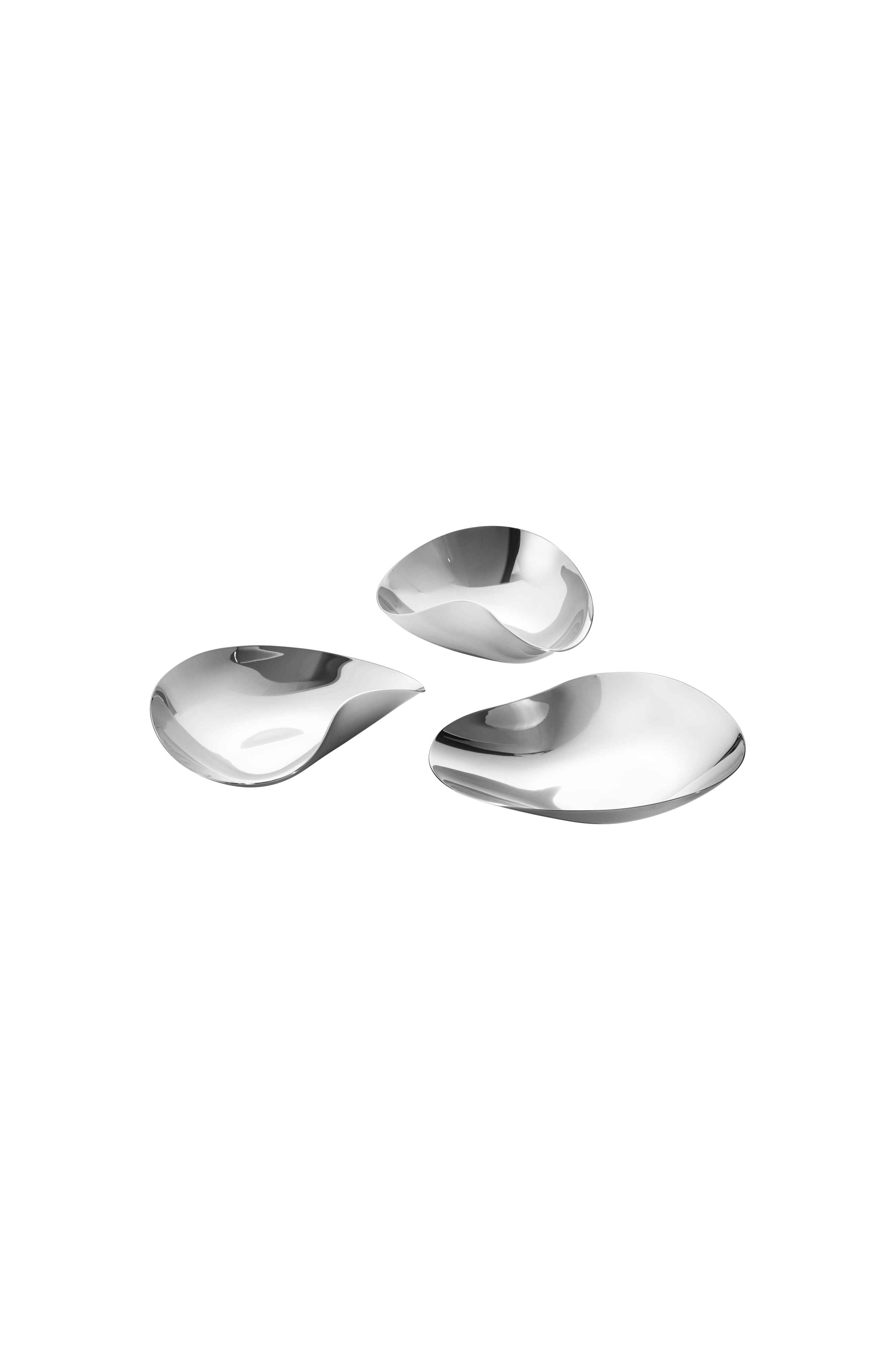3 stk snacksskåler i rustfritt stål, designet av Helle Damkjær. Bruk de til oliven, nøtter, chips og mye mer. Den organiske designen gjør at du lett kan arrangere skålene som du ønsker, enten fordelt på hele bordet eller i små grupper. Skålene tåler ikke oppvaskmaskin.