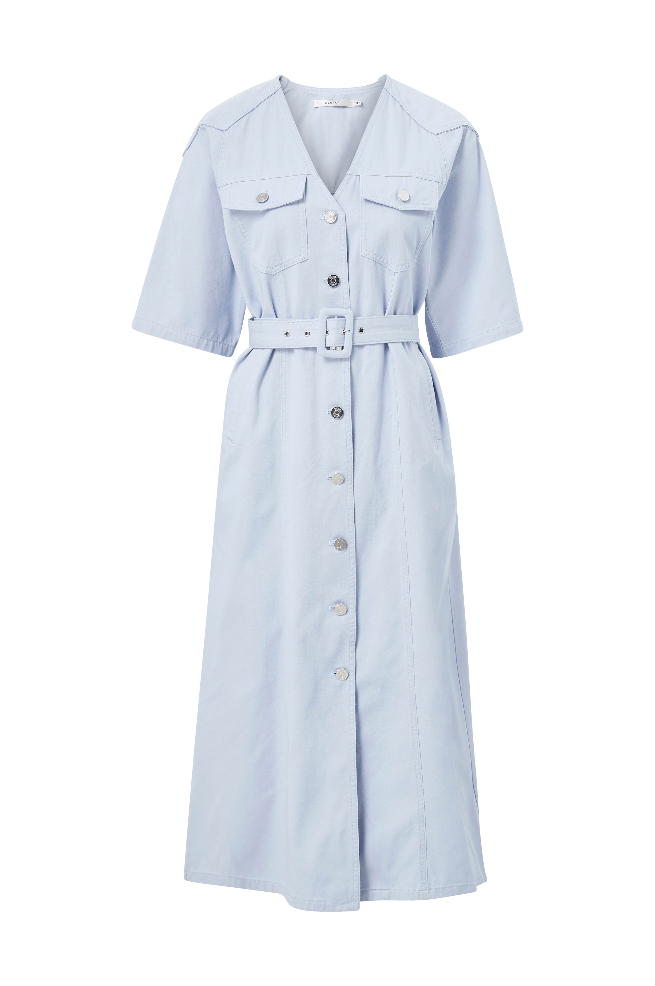 Kjole i kraftig kvalitet med langsgående pyntesømmer. V-formet bærestykke som går ut over de korte ermene. V-utringet hals og knapping hele veien foran med metallknapper. To innfelte lommer og to brystlommer med klaff, samt belte med kledd spenne i midjen. Lengde ca. 126 cm i str 36.