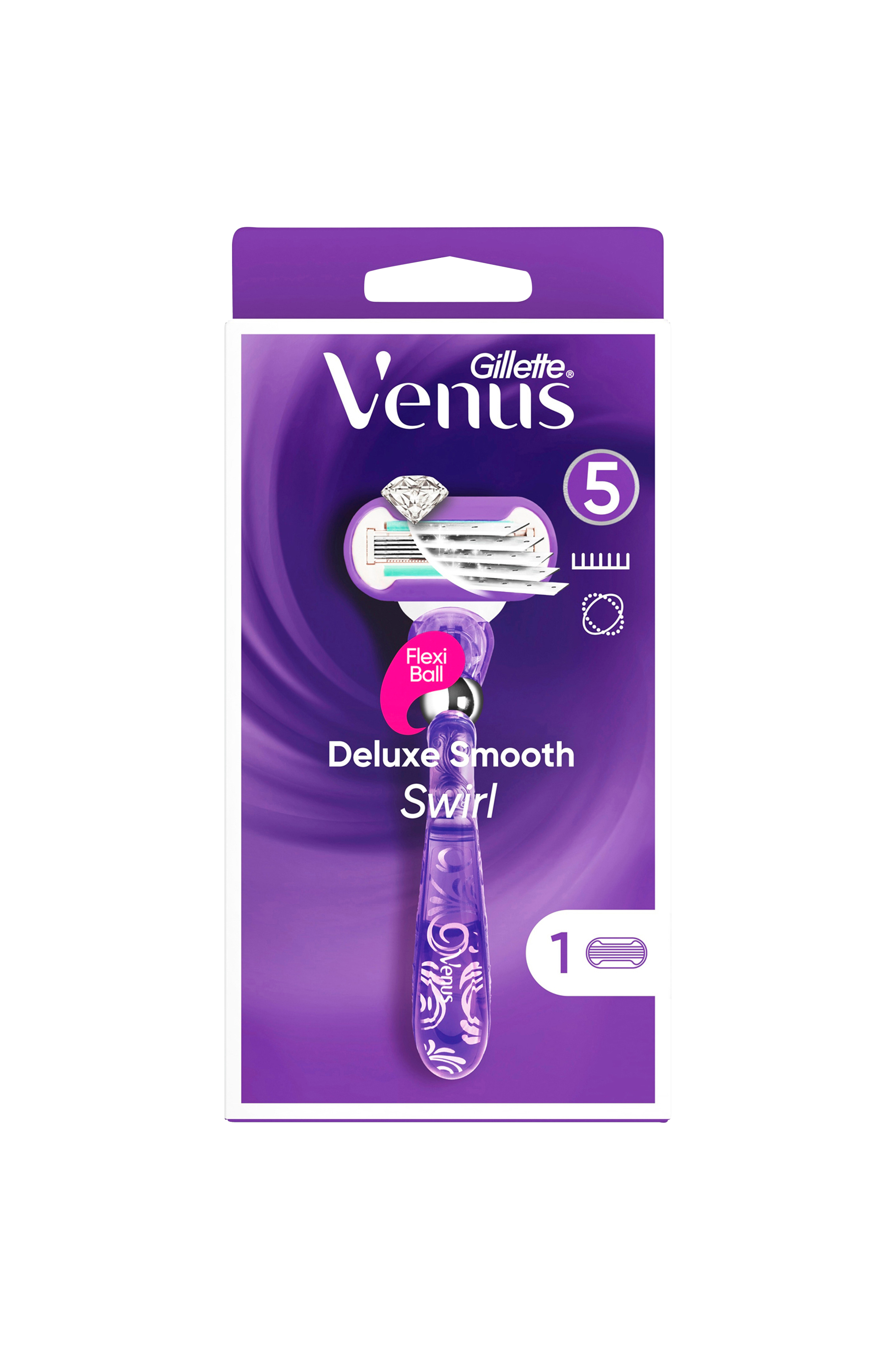 Venus Deluxe Smooth Swirl barberhøvel for kvinner gir myk hud som varer. Barberbladrefillene har 5 blad for supertett barbering og innebygd flexiball som tilpasser seg kroppens konturer. Barberbladene barberer tettere på huden, for mykhet som varer. Bladenes vannaktiverte fuktremse bidrar til å beskytte mot kutt og skraper.