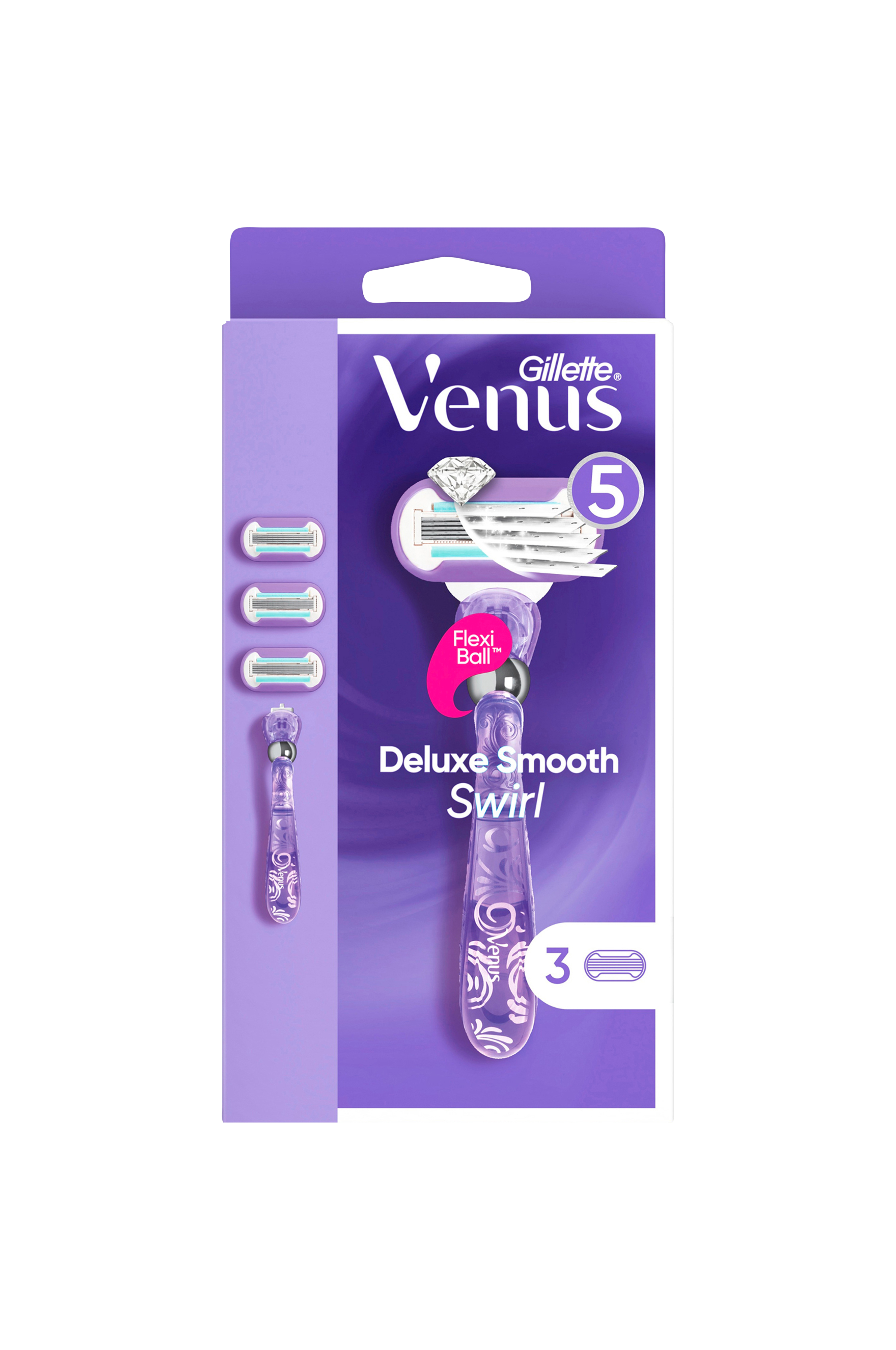Venus Deluxe Smooth Swirl barberhøvel for kvinner gir myk hud som varer. Barberbladrefillene har 5 blad for supertett barbering og innebygd flexiball som tilpasser seg kroppens konturer. Barberbladene barberer tettere på huden, for mykhet som varer. Bladenes vannaktiverte fuktremse bidrar til å beskytte mot kutt og skraper.