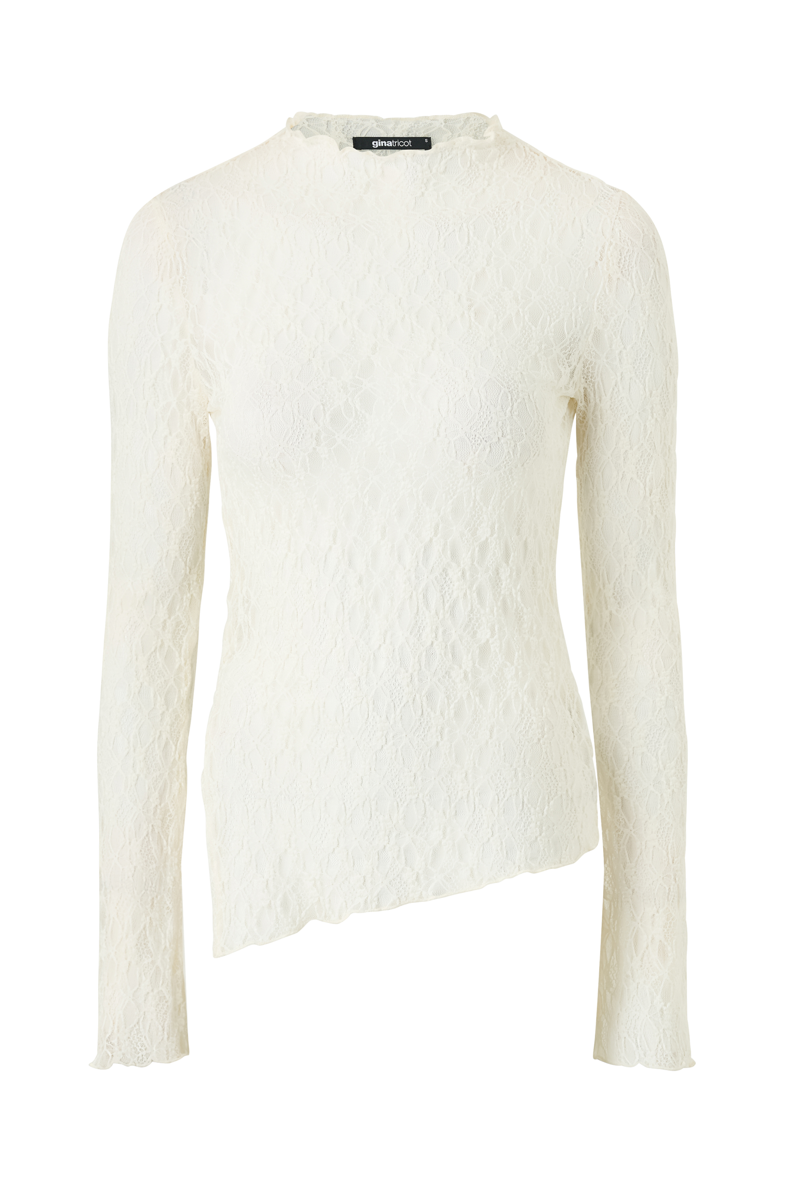 • Asymmetrisk topp i blonde• Høy krage• Lange ermer• Bølgede kanter• Splitt nedtil på ene siden