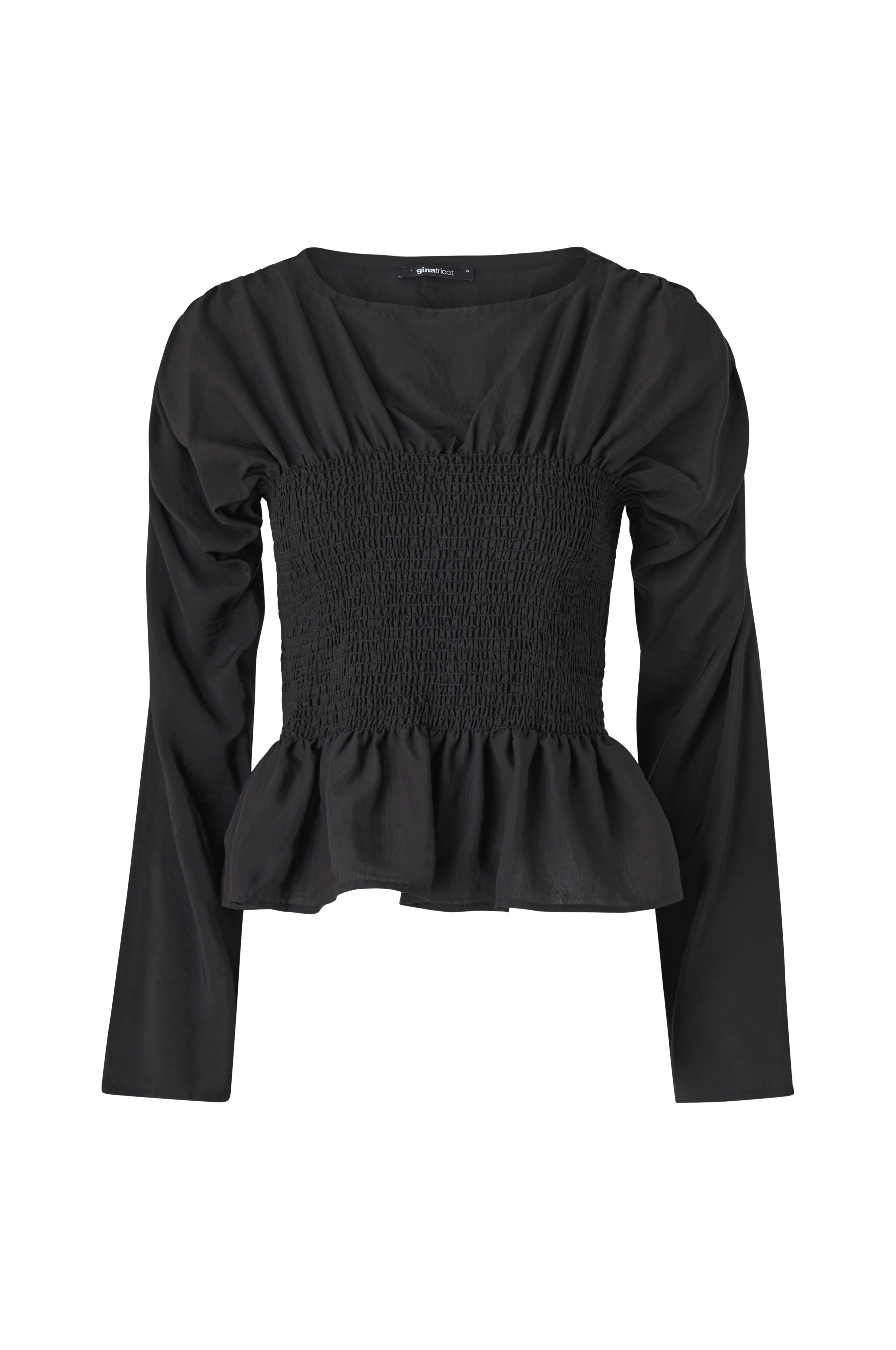 • Design med en vaffelsøm• Lange ermer• Rysje på skuldrene• Volang på bunnen