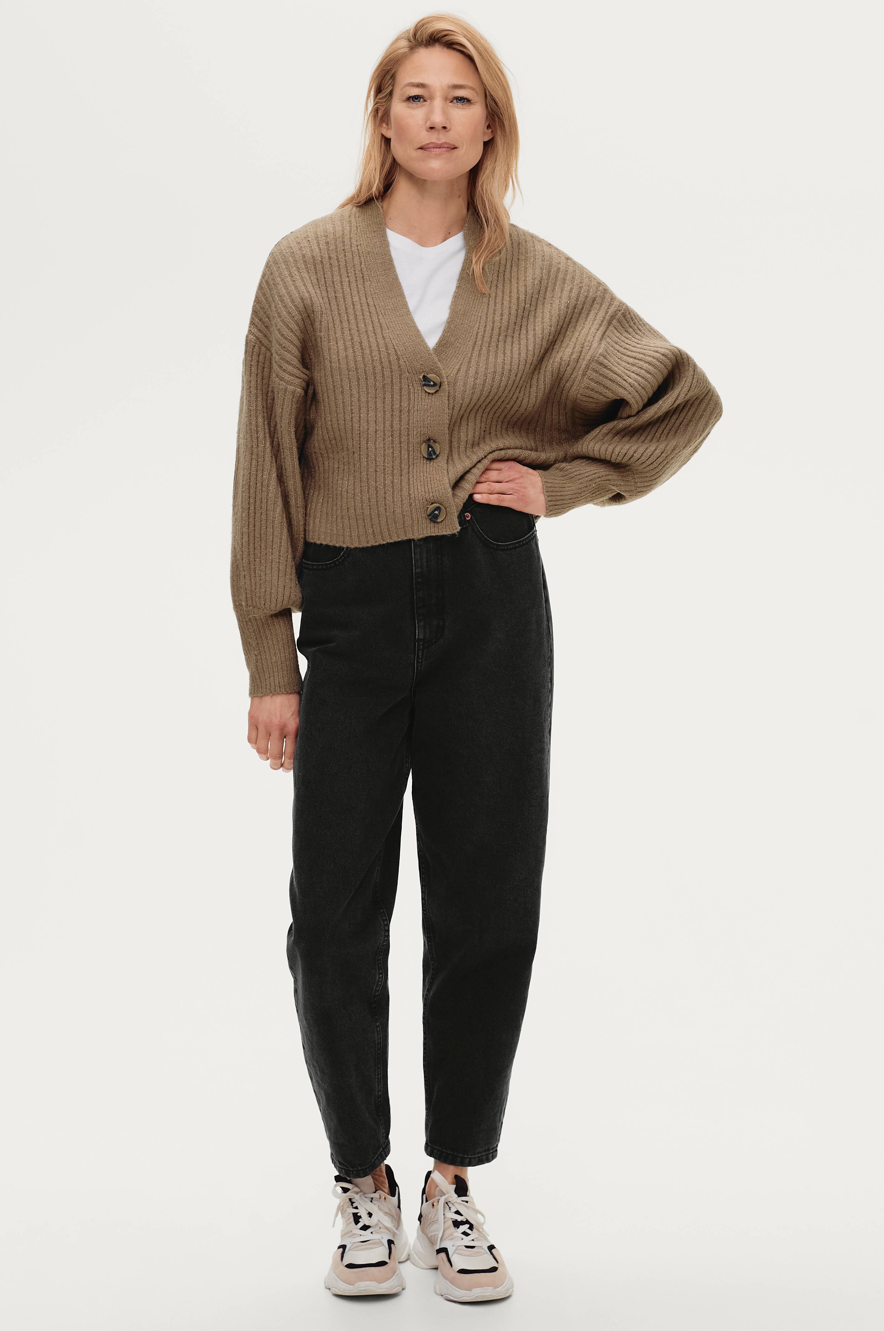 Strikket cardigan i kort modell. Lange, vide ermer med smal vrangbord i ermekantene. Tre knapper.