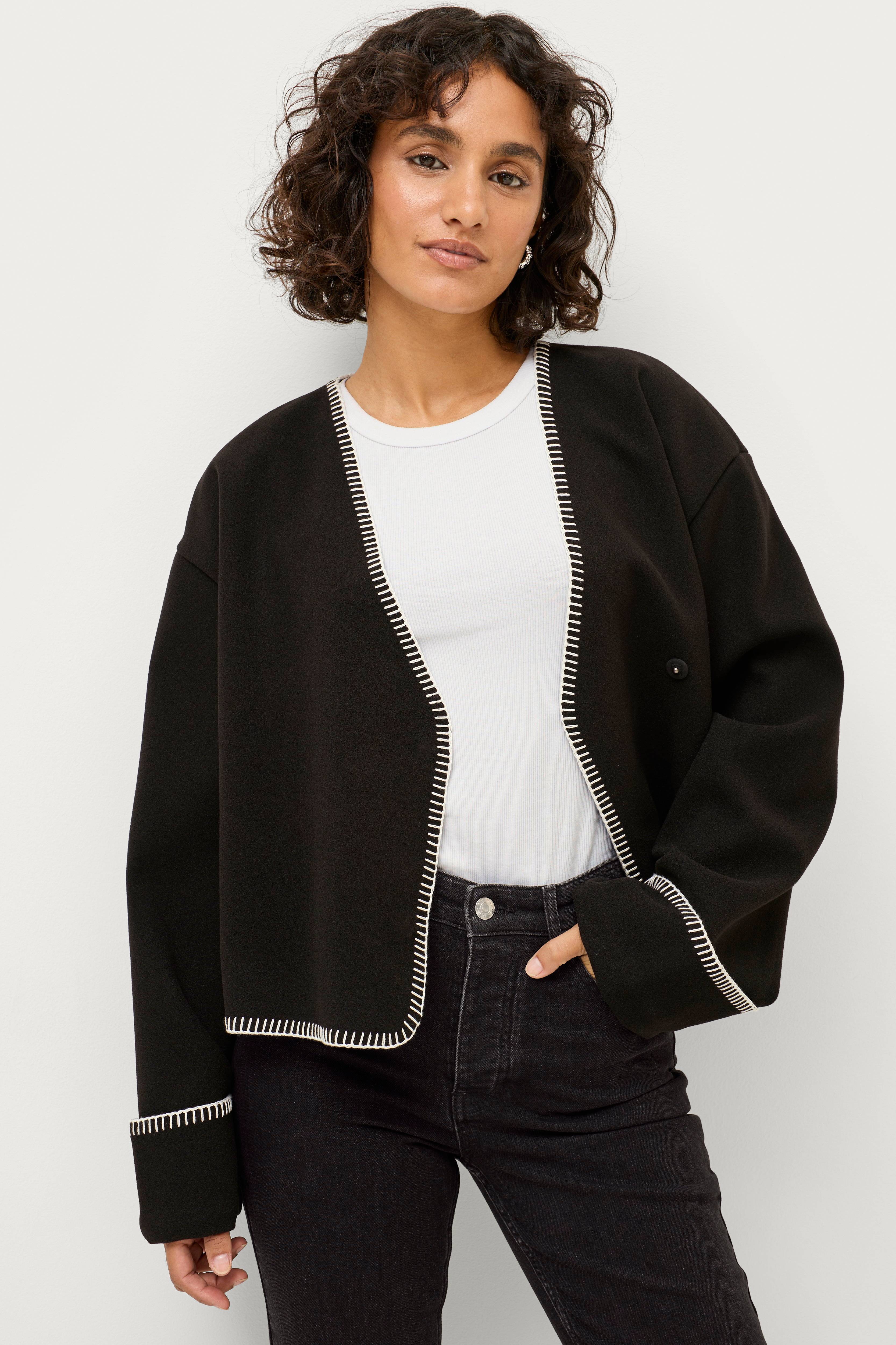 • Kort, rett omslagsmodell• Broderte kanter• Skjulte trykknapper• Utringet skulder• Lang, rett arm med festede opprullede ermer i ermeslutten• Lengde: 53 cm i størrelse S