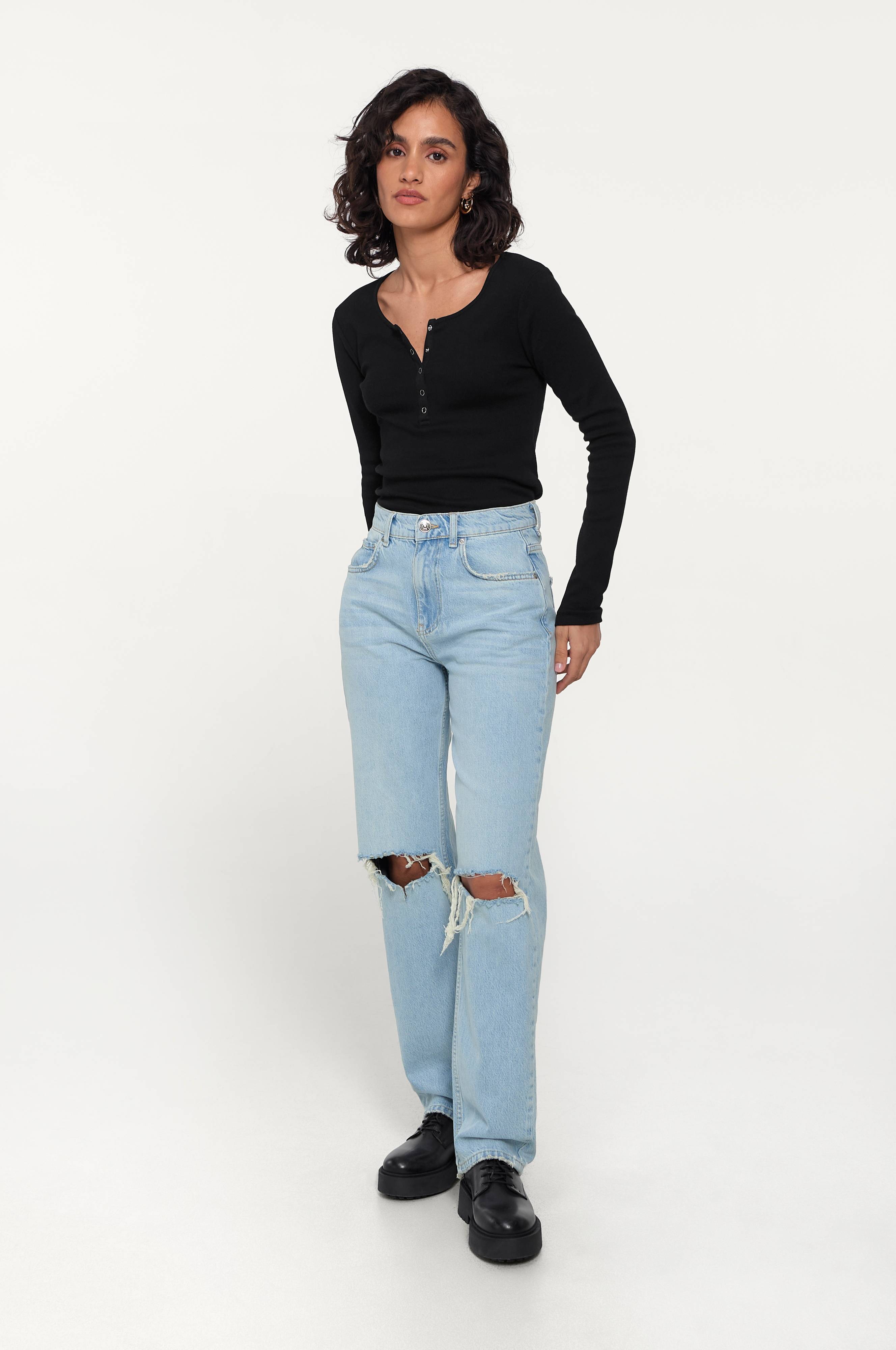Modell med høy midje og vide, rette ben. Tre lommer foran, to påsydde baklommer samt glidelås i gylfen. Indre benlengde ca. 79 cm i str 36.