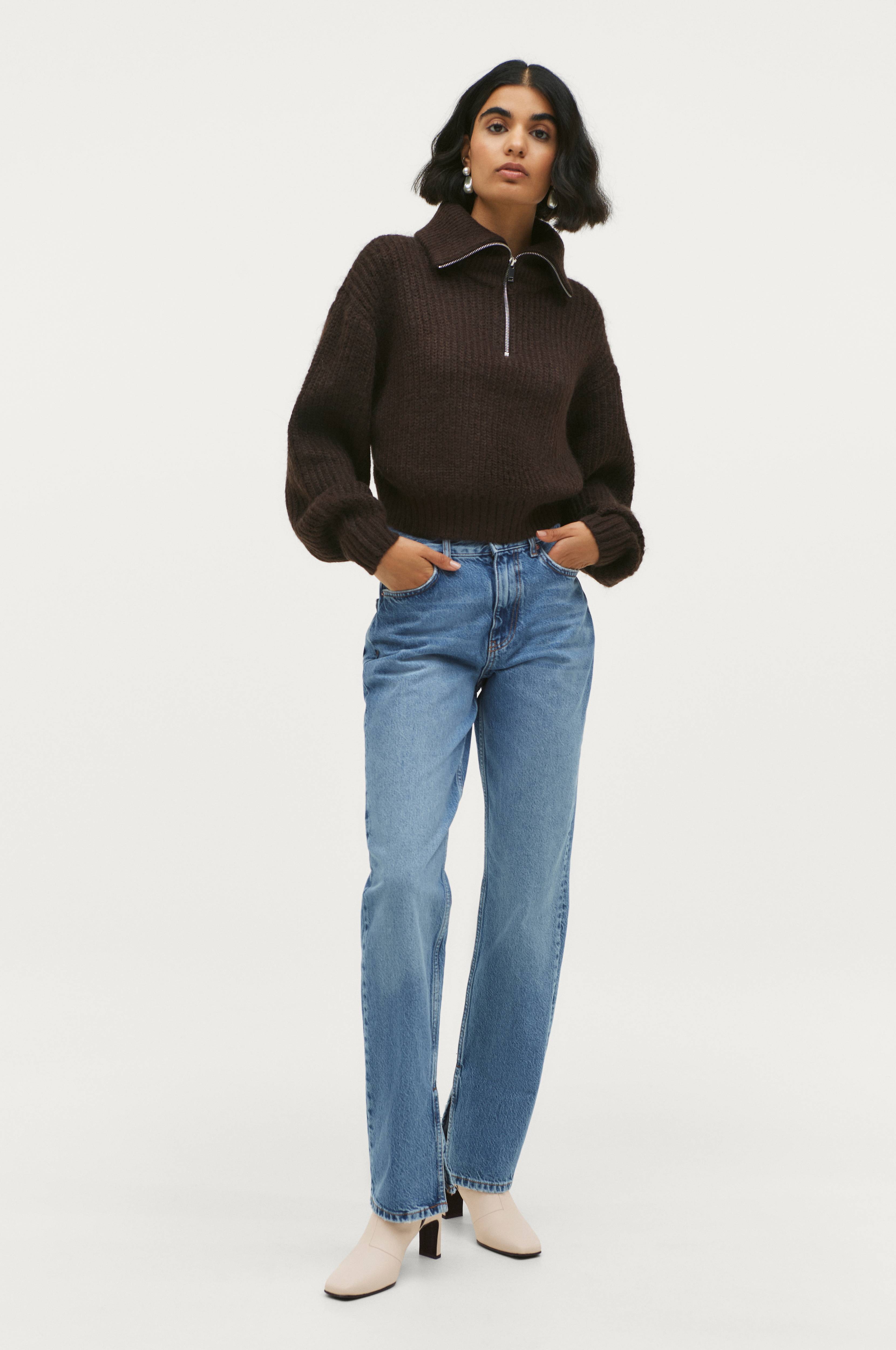 - Femlommersmodell- Høy midje- Rett passform- Glidelåsgylf- Splitt i benkantene- Av denim